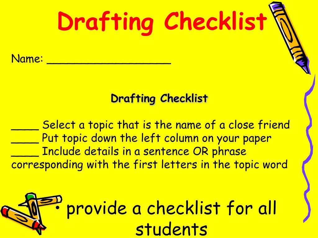 Drafting Checklist Name: __________________ Drafting Checklist ____ Select a topic that is the name of a close friend ____ Put topic down the left column on your paper ____ Include details in a sentence OR phrase corresponding with the first letters in the topic word • provide a checklist for all students