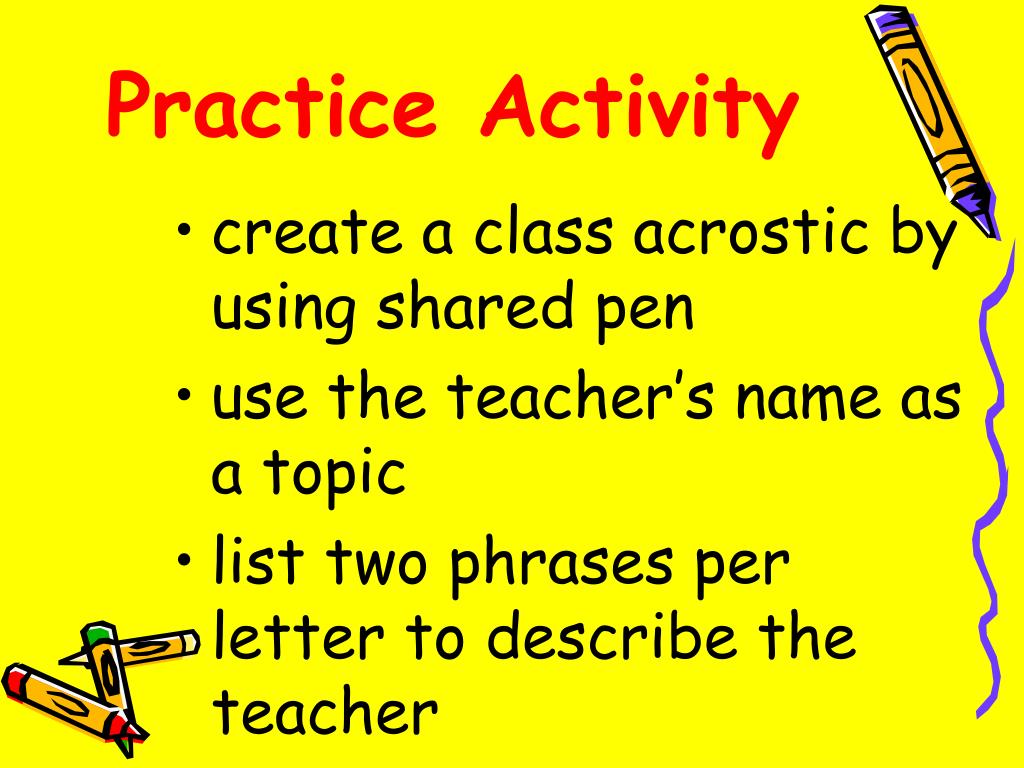 Practice Activity • create a class acrostic by using shared pen • use the teacher’s name as a topic • list two phrases per letter to describe the teacher