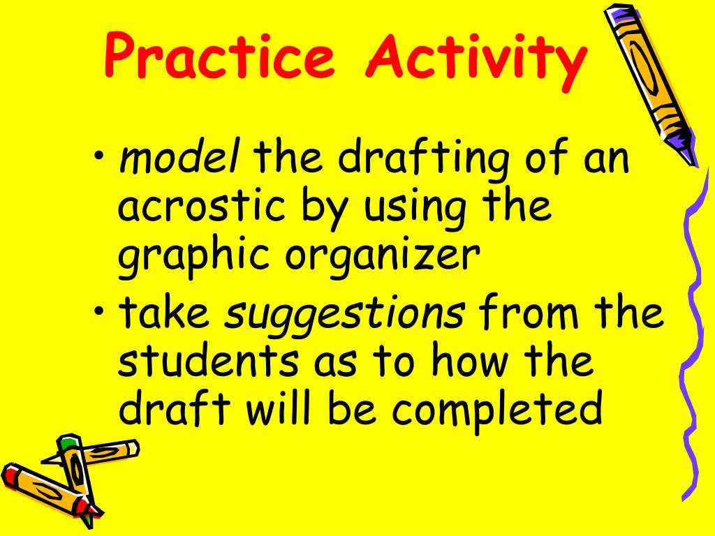 Practice Activity • model the drafting of an acrostic by using the graphic organizer • take suggestions from the students as to how the draft will be completed