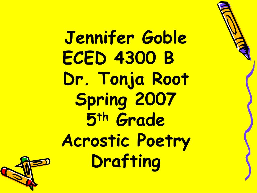 Jennifer Goble ECED 4300 B Dr. Tonja RootSpring 20075th Grade Acrostic PoetryDrafting