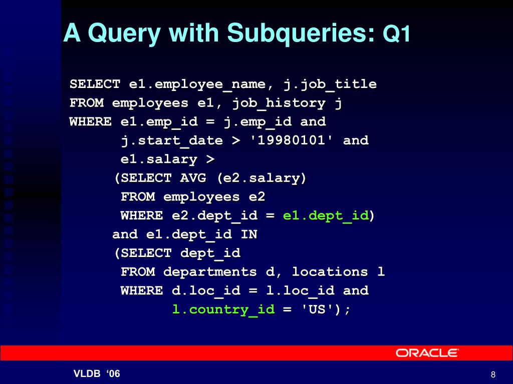 A Query with Subqueries: Q1 SELECT e1.employee_name, j.job_title FROM employees e1, job_history j WHERE e1.emp_id = j.emp_id and j.start_date > '19980101' and e1.salary > (SELECT AVG (e2.salary) FROM employees e2 WHERE e2.dept_id = e1.dept_id) and e1.dept_id IN (SELECT dept_id FROM departments d, locations l WHERE d.loc_id = l.loc_id and l.country_id = 'US');