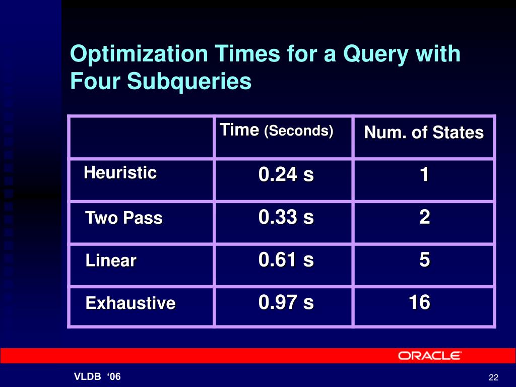 Performance Study • Oracle Application: HR, OE, CRM, Financial, Supply Chain, etc. • Schema: 14,000 tables • Average of 8 tables per query (1 – 159) • Workload: 241,000 queries – mostly of SPJ types • 19,000 – 8% – queries relevant to cost-based transformation