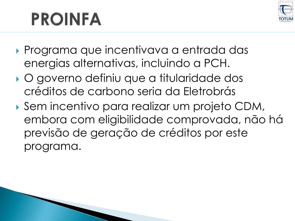 PROINFA • Programa que incentivava a entrada das energias alternativas, incluindo a PCH. • O governo definiu que a titularidade dos créditos de carbono seria da Eletrobrás • Sem incentivo para realizar um projeto CDM, embora com eligibilidade comprovada, não há previsão de geração de créditos por este programa.