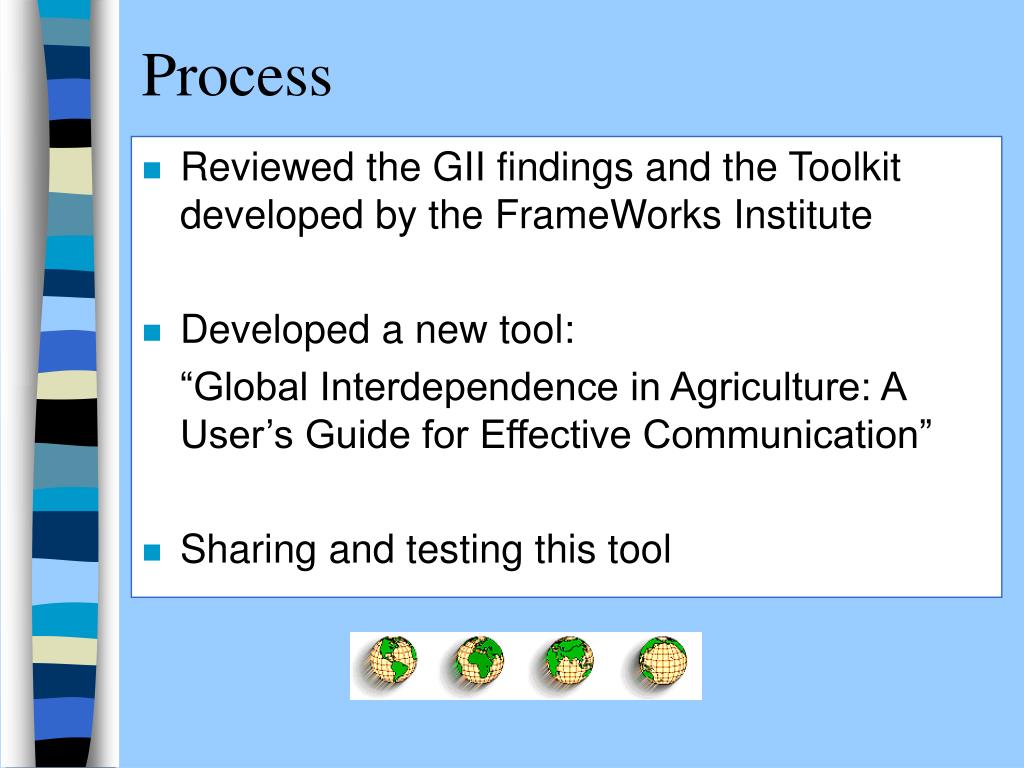 Process • Reviewed the GII findings and the Toolkit developed by the FrameWorks Institute • Developed a new tool: “Global Interdependence in Agriculture: A User’s Guide for Effective Communication” • Sharing and testing this tool