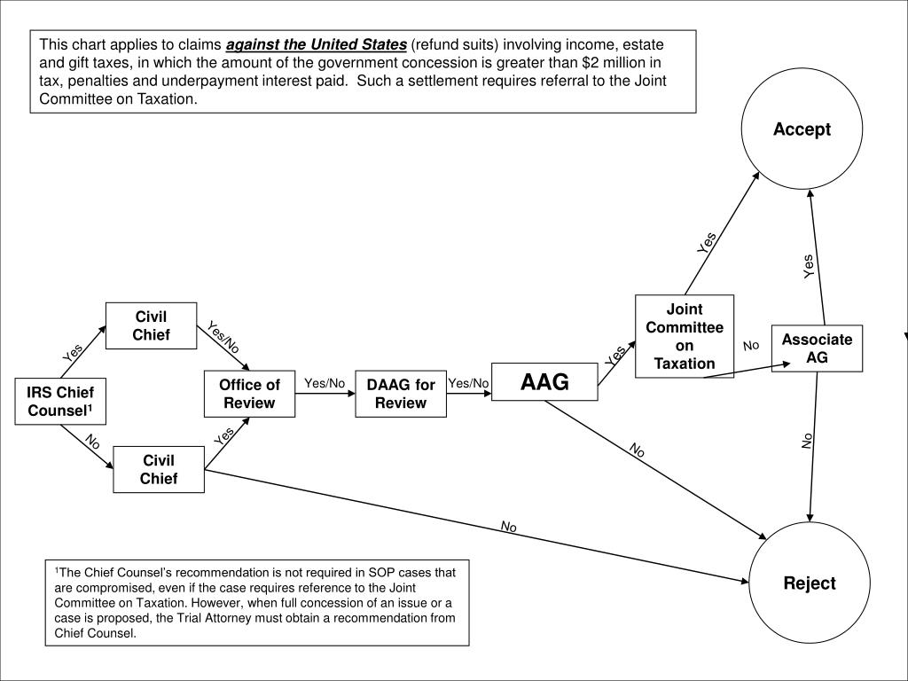 Reject Accept This chart applies to claims against the United States (refund suits) involving income, estate and gift taxes, in which the amount of the government concession is greater than $2 million in tax, penalties and underpayment interest paid. Such a settlement requires referral to the Joint Committee on Taxation. Yes Yes Joint Committee on Taxation CivilChief Yes/No Associate AG No Yes Yes AAG Office of Review Yes/No DAAG for Review Yes/No IRS Chief Counsel1 Yes No No No CivilChief No 1The Chief Counsel’s recommendation is not required in SOP cases that are compromised, even if the case requires reference to the Joint Committee on Taxation. However, when full concession of an issue or a case is proposed, the Trial Attorney must obtain a recommendation from Chief Counsel.