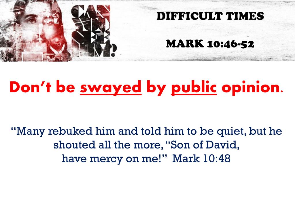 DIFFICULT TIMES MARK 10:46-52 Don’t be swayed by public opinion. “Many rebuked him and told him to be quiet, but he shouted all the more, “Son of David, have mercy on me!” Mark 10:48