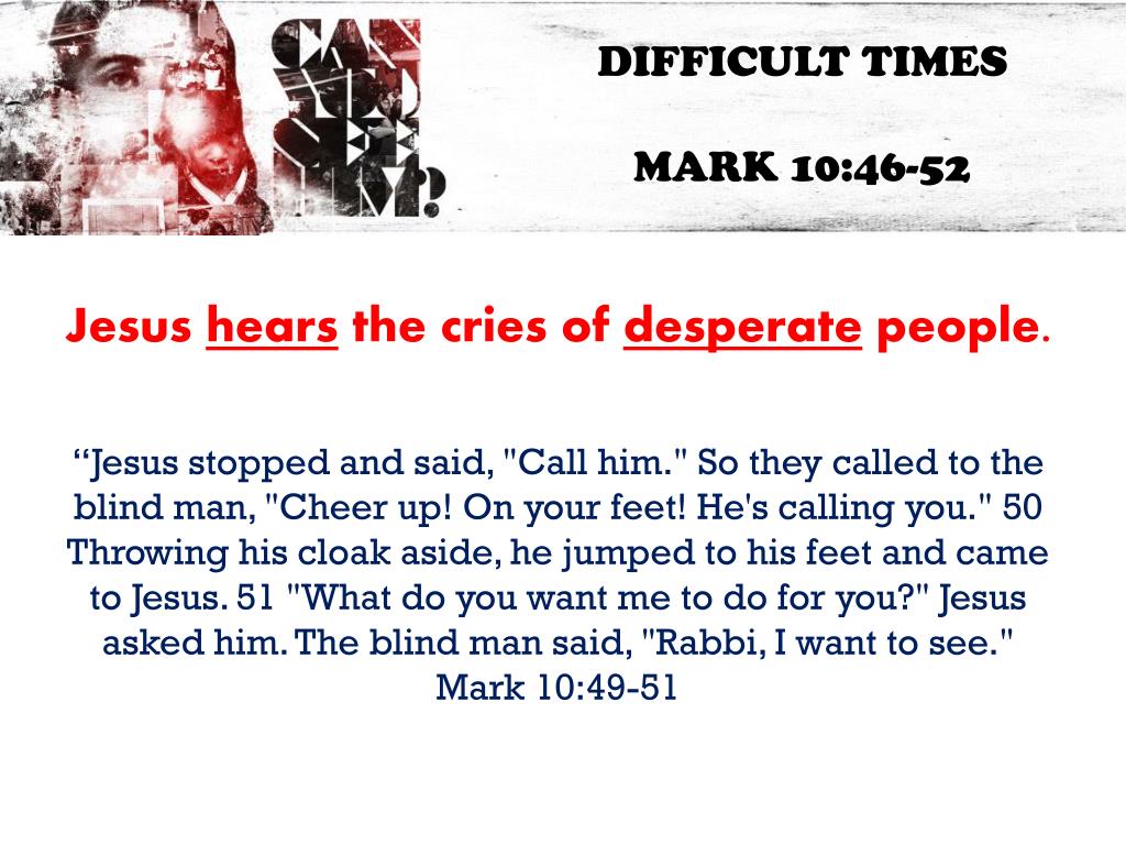 DIFFICULT TIMES MARK 10:46-52 Jesus hears the cries of desperate people. “Jesus stopped and said, "Call him." So they called to the blind man, "Cheer up! On your feet! He's calling you." 50 Throwing his cloak aside, he jumped to his feet and came to Jesus. 51 "What do you want me to do for you?" Jesus asked him. The blind man said, "Rabbi, I want to see." Mark 10:49-51