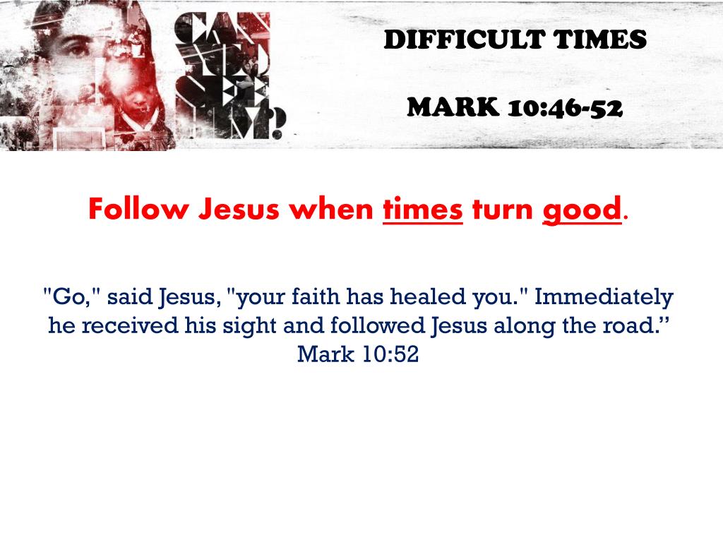 DIFFICULT TIMES MARK 10:46-52 Follow Jesus when times turn good. "Go," said Jesus, "your faith has healed you." Immediately he received his sight and followed Jesus along the road.” Mark 10:52