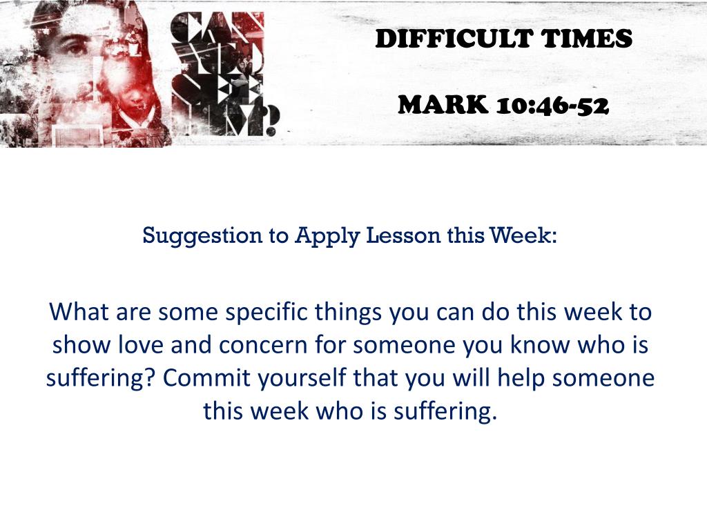 DIFFICULT TIMES MARK 10:46-52 Suggestion to Apply Lesson this Week: What are some specific things you can do this week to show love and concern for someone you know who is suffering? Commit yourself that you will help someone this week who is suffering.