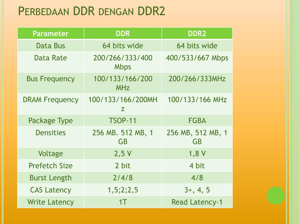 Perbedaanmendasardari DDR2 dan DDR3 adalah : - Clock DDR2 400 – 800 MHz (1000 oc); Clock DDR3 800 – 1600 MHz (2000oc) - VDD/VDDQ DDR 1.8V/1V; VDD DDR3 1.5V/0.075V - Driver Control DDR2-OCD, sedang DDR3 dengan self control ZQ - DDR3 telahmendukung leveling