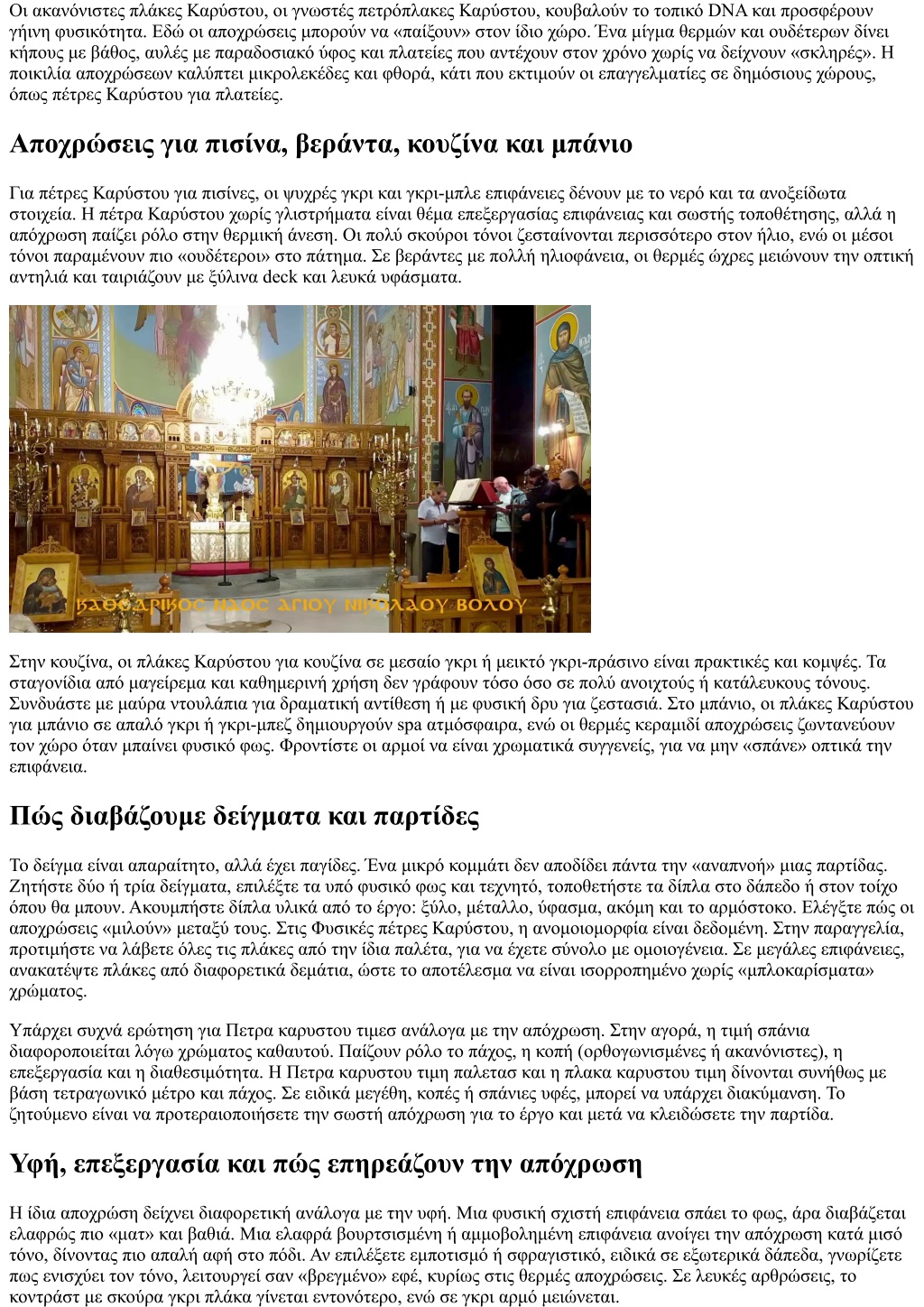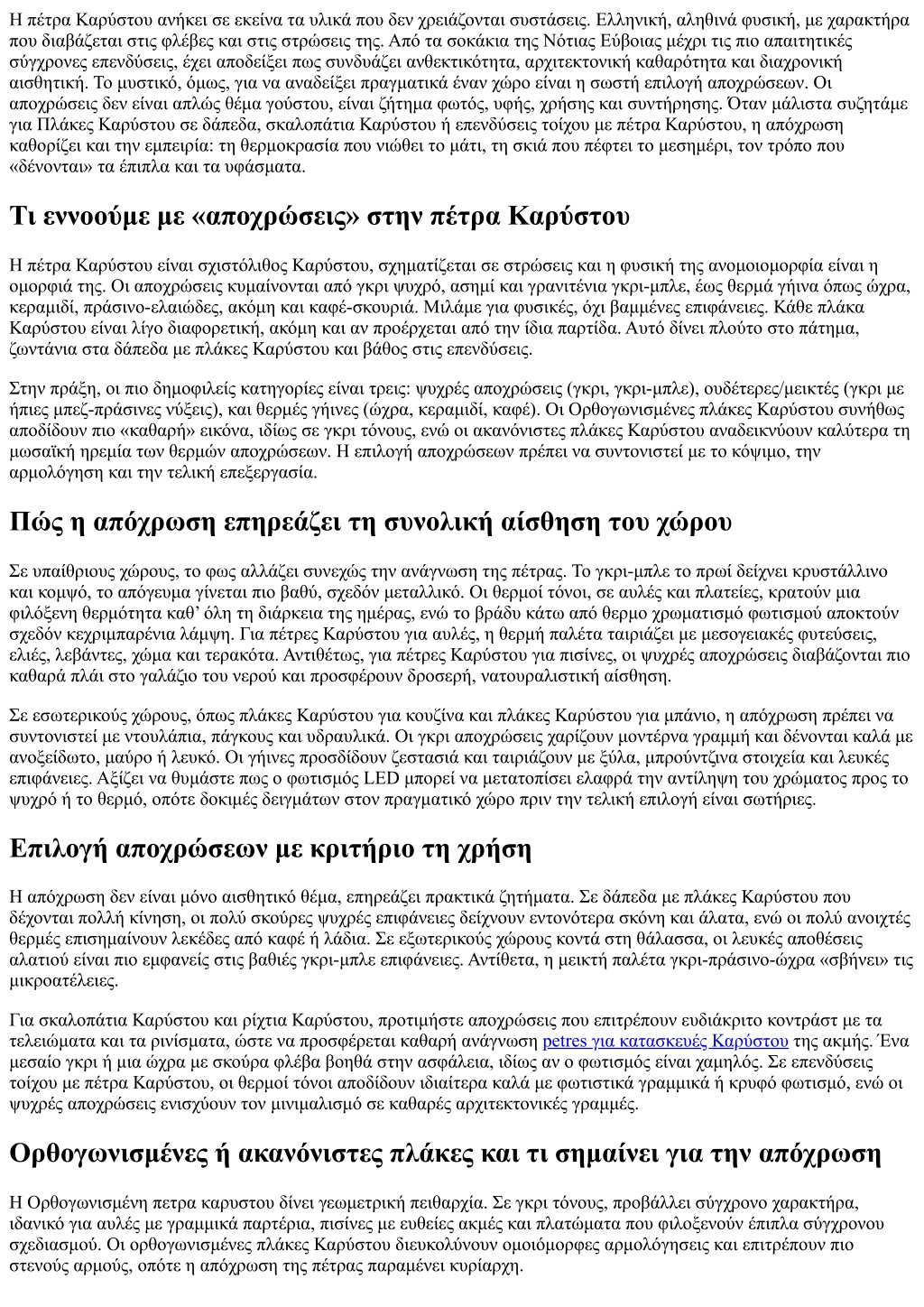 Οι ακανόνιστες πλάκες Καρύστου, οι γνωστές πετρόπλακες Καρύστου, κουβαλούν το τοπικό DNA και προσφέρουν γήινη φυσικότητα. Εδώ οι αποχρώσεις μπορούν να «παίξουν» στον ίδιο χώρο. Ένα μίγμα θερμών και ουδέτερων δίνει κήπους με βάθος, αυλές με παραδοσιακό ύφος και πλατείες που αντέχουν στον χρόνο χωρίς να δείχνουν «σκληρές». Η ποικιλία αποχρώσεων καλύπτει μικρολεκέδες και φθορά, κάτι που εκτιμούν οι επαγγελματίες σε δημόσιους χώρους, όπως πέτρες Καρύστου για πλατείες. Αποχρώσεις για πισίνα, βεράντα, κουζίνα και μπάνιο Για πέτρες Καρύστου για πισίνες, οι ψυχρές γκρι και γκρι-μπλε επιφάνειες δένουν με το νερό και τα ανοξείδωτα στοιχεία. Η πέτρα Καρύστου χωρίς γλιστρήματα είναι θέμα επεξεργασίας επιφάνειας και σωστής τοποθέτησης, αλλά η απόχρωση παίζει ρόλο στην θερμική άνεση. Οι πολύ σκούροι τόνοι ζεσταίνονται περισσότερο στον ήλιο, ενώ οι μέσοι τόνοι παραμένουν πιο «ουδέτεροι» στο πάτημα. Σε βεράντες με πολλή ηλιοφάνεια, οι θερμές ώχρες μειώνουν την οπτική αντηλιά και ταιριάζουν με ξύλινα deck και λευκά υφάσματα. Στην κουζίνα, οι πλάκες Καρύστου για κουζίνα σε μεσαίο γκρι ή μεικτό γκρι-πράσινο είναι πρακτικές και κομψές. Τα σταγονίδια από μαγείρεμα και καθημερινή χρήση δεν γράφουν τόσο όσο σε πολύ ανοιχτούς ή κατάλευκους τόνους. Συνδυάστε με μαύρα ντουλάπια για δραματική αντίθεση ή με φυσική δρυ για ζεστασιά. Στο μπάνιο, οι πλάκες Καρύστου για μπάνιο σε απαλό γκρι ή γκρι-μπεζ δημιουργούν spa ατμόσφαιρα, ενώ οι θερμές κεραμιδί αποχρώσεις ζωντανεύουν τον χώρο όταν μπαίνει φυσικό φως. Φροντίστε οι αρμοί να είναι χρωματικά συγγενείς, για να μην «σπάνε» οπτικά την επιφάνεια. Πώς διαβάζουμε δείγματα και παρτίδες Το δείγμα είναι απαραίτητο, αλλά έχει παγίδες. Ένα μικρό κομμάτι δεν αποδίδει πάντα την «αναπνοή» μιας παρτίδας. Ζητήστε δύο ή τρία δείγματα, επιλέξτε τα υπό φυσικό φως και τεχνητό, τοποθετήστε τα δίπλα στο δάπεδο ή στον τοίχο όπου θα μπουν. Ακουμπήστε δίπλα υλικά από το έργο: ξύλο, μέταλλο, ύφασμα, ακόμη και το αρμόστοκο. Ελέγξτε πώς οι αποχρώσεις «μιλούν» μεταξύ τους. Στις Φυσικές πέτρες Καρύστου, η ανομοιομορφία είναι δεδομένη. Στην παραγγελία, προτιμήστε να λάβετε όλες τις πλάκες από την ίδια παλέτα, για να έχετε σύνολο με ομοιογένεια. Σε μεγάλες επιφάνειες, ανακατέψτε πλάκες από διαφορετικά δεμάτια, ώστε το αποτέλεσμα να είναι ισορροπημένο χωρίς «μπλοκαρίσματα» χρώματος. Υπάρχει συχνά ερώτηση για Πετρα καρυστου τιμεσ ανάλογα με την απόχρωση. Στην αγορά, η τιμή σπάνια διαφοροποιείται λόγω χρώματος καθαυτού. Παίζουν ρόλο το πάχος, η κοπή (ορθογωνισμένες ή ακανόνιστες), η επεξεργασία και η διαθεσιμότητα. Η Πετρα καρυστου τιμη παλετασ και η πλακα καρυστου τιμη δίνονται συνήθως με βάση τετραγωνικό μέτρο και πάχος. Σε ειδικά μεγέθη, κοπές ή σπάνιες υφές, μπορεί να υπάρχει διακύμανση. Το ζητούμενο είναι να προτεραιοποιήσετε την σωστή απόχρωση για το έργο και μετά να κλειδώσετε την παρτίδα. Υφή, επεξεργασία και πώς επηρεάζουν την απόχρωση Η ίδια αποχρώση δείχνει διαφορετική ανάλογα με την υφή. Μια φυσική σχιστή επιφάνεια σπάει το φως, άρα διαβάζεται ελαφρώς πιο «ματ» και βαθιά. Μια ελαφρά βουρτσισμένη ή αμμοβολημένη επιφάνεια ανοίγει την απόχρωση κατά μισό τόνο, δίνοντας πιο απαλή αφή στο πόδι. Αν επιλέξετε εμποτισμό ή σφραγιστικό, ειδικά σε εξωτερικά δάπεδα, γνωρίζετε πως ενισχύει τον τόνο, λειτουργεί σαν «βρεγμένο» εφέ, κυρίως στις θ