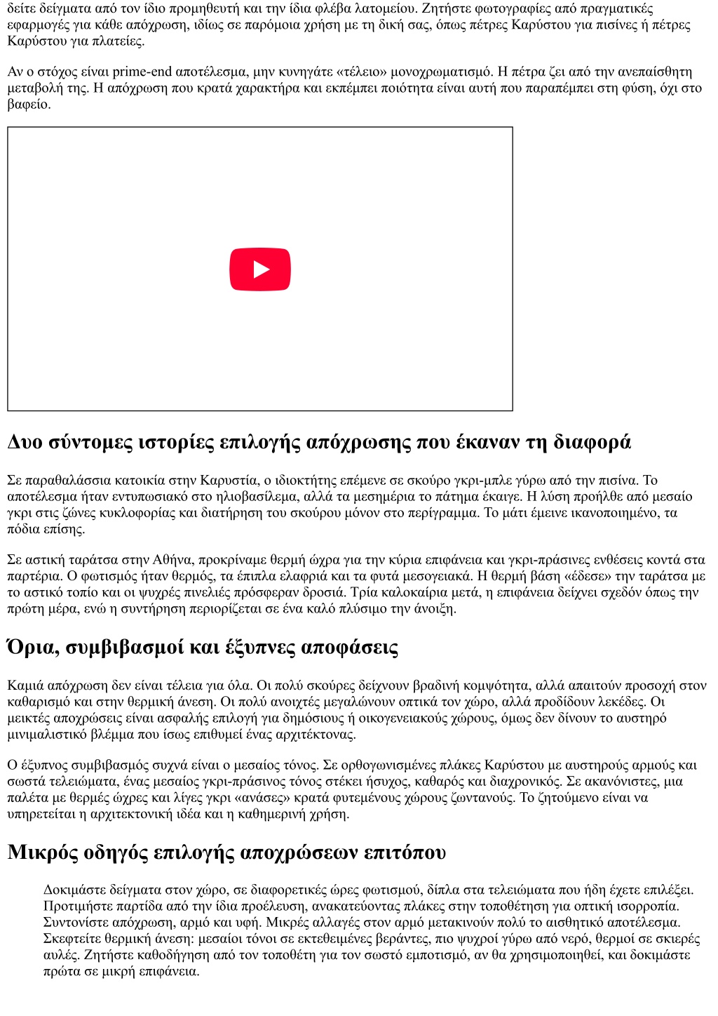 δείτε δείγματα από τον ίδιο προμηθευτή και την ίδια φλέβα λατομείου. Ζητήστε φωτογραφίες από πραγματικές εφαρμογές για κάθε απόχρωση, ιδίως σε παρόμοια χρήση με τη δική σας, όπως πέτρες Καρύστου για πισίνες ή πέτρες Καρύστου για πλατείες. Αν ο στόχος είναι prime-end αποτέλεσμα, μην κυνηγάτε «τέλειο» μονοχρωματισμό. Η πέτρα ζει από την ανεπαίσθητη μεταβολή της. Η απόχρωση που κρατά χαρακτήρα και εκπέμπει ποιότητα είναι αυτή που παραπέμπει στη φύση, όχι στο βαφείο. Δυο σύντομες ιστορίες επιλογής απόχρωσης που έκαναν τη διαφορά Σε παραθαλάσσια κατοικία στην Καρυστία, ο ιδιοκτήτης επέμενε σε σκούρο γκρι-μπλε γύρω από την πισίνα. Το αποτέλεσμα ήταν εντυπωσιακό στο ηλιοβασίλεμα, αλλά τα μεσημέρια το πάτημα έκαιγε. Η λύση προήλθε από μεσαίο γκρι στις ζώνες κυκλοφορίας και διατήρηση του σκούρου μόνον στο περίγραμμα. Το μάτι έμεινε ικανοποιημένο, τα πόδια επίσης. Σε αστική ταράτσα στην Αθήνα, προκρίναμε θερμή ώχρα για την κύρια επιφάνεια και γκρι-πράσινες ενθέσεις κοντά στα παρτέρια. Ο φωτισμός ήταν θερμός, τα έπιπλα ελαφριά και τα φυτά μεσογειακά. Η θερμή βάση «έδεσε» την ταράτσα με το αστικό τοπίο και οι ψυχρές πινελιές πρόσφεραν δροσιά. Τρία καλοκαίρια μετά, η επιφάνεια δείχνει σχεδόν όπως την πρώτη μέρα, ενώ η συντήρηση περιορίζεται σε ένα καλό πλύσιμο την άνοιξη. Όρια, συμβιβασμοί και έξυπνες αποφάσεις Καμιά απόχρωση δεν είναι τέλεια για όλα. Οι πολύ σκούρες δείχνουν βραδινή κομψότητα, αλλά απαιτούν προσοχή στον καθαρισμό και στην θερμική άνεση. Οι πολύ ανοιχτές μεγαλώνουν οπτικά τον χώρο, αλλά προδίδουν λεκέδες. Οι μεικτές αποχρώσεις είναι ασφαλής επιλογή για δημόσιους ή οικογενειακούς χώρους, όμως δεν δίνουν το αυστηρό μινιμαλιστικό βλέμμα που ίσως επιθυμεί ένας αρχιτέκτονας. Ο έξυπνος συμβιβασμός συχνά είναι ο μεσαίος τόνος. Σε ορθογωνισμένες πλάκες Καρύστου με αυστηρούς αρμούς και σωστά τελειώματα, ένας μεσαίος γκρι-πράσινος τόνος στέκει ήσυχος, καθαρός και διαχρονικός. Σε ακανόνιστες, μια παλέτα με θερμές ώχρες και λίγες γκρι «ανάσες» κρατά φυτεμένους χώρους ζωντανούς. Το ζητούμενο είναι να υπηρετείται η αρχιτεκτονική ιδέα και η καθημερινή χρήση. Μικρός οδηγός επιλογής αποχρώσεων επιτόπου Δοκιμάστε δείγματα στον χώρο, σε διαφορετικές ώρες φωτισμού, δίπλα στα τελειώματα που ήδη έχετε επιλέξει. Προτιμήστε παρτίδα από την ίδια προέλευση, ανακατεύοντας πλάκες στην τοποθέτηση για οπτική ισορροπία. Συντονίστε απόχρωση, αρμό και υφή. Μικρές αλλαγές στον αρμό μετακινούν πολύ το αισθητικό αποτέλεσμα. Σκεφτείτε θερμική άνεση: μεσαίοι τόνοι σε εκτεθειμένες βεράντες, πιο ψυχροί γύρω από νερό, θερμοί σε σκιερές αυλές. Ζητήστε καθοδήγηση από τον τοποθέτη για τον σωστό εμποτισμό, αν θα χρησιμοποιηθεί, και δοκιμάστε πρώτα σε μικρή επιφάνεια.