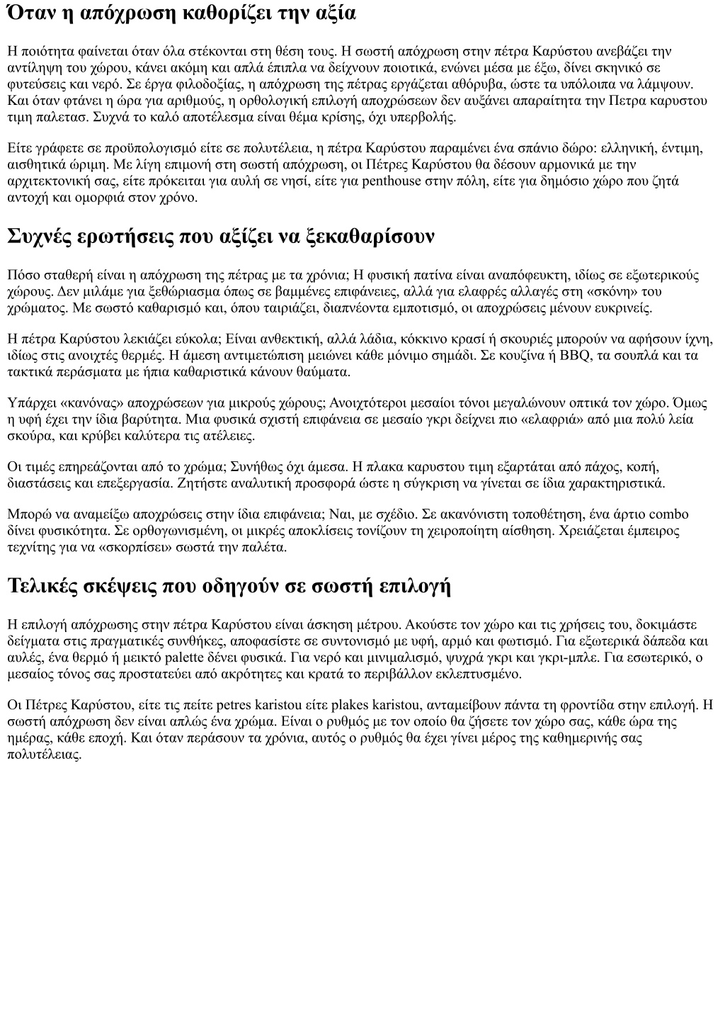 Όταν η απόχρωση καθορίζει την αξία Η ποιότητα φαίνεται όταν όλα στέκονται στη θέση τους. Η σωστή απόχρωση στην πέτρα Καρύστου ανεβάζει την αντίληψη του χώρου, κάνει ακόμη και απλά έπιπλα να δείχνουν ποιοτικά, ενώνει μέσα με έξω, δίνει σκηνικό σε φυτεύσεις και νερό. Σε έργα φιλοδοξίας, η απόχρωση της πέτρας εργάζεται αθόρυβα, ώστε τα υπόλοιπα να λάμψουν. Και όταν φτάνει η ώρα για αριθμούς, η ορθολογική επιλογή αποχρώσεων δεν αυξάνει απαραίτητα την Πετρα καρυστου τιμη παλετασ. Συχνά το καλό αποτέλεσμα είναι θέμα κρίσης, όχι υπερβολής. Είτε γράφετε σε προϋπολογισμό είτε σε πολυτέλεια, η πέτρα Καρύστου παραμένει ένα σπάνιο δώρο: ελληνική, έντιμη, αισθητικά ώριμη. Με λίγη επιμονή στη σωστή απόχρωση, οι Πέτρες Καρύστου θα δέσουν αρμονικά με την αρχιτεκτονική σας, είτε πρόκειται για αυλή σε νησί, είτε για penthouse στην πόλη, είτε για δημόσιο χώρο που ζητά αντοχή και ομορφιά στον χρόνο. Συχνές ερωτήσεις που αξίζει να ξεκαθαρίσουν Πόσο σταθερή είναι η απόχρωση της πέτρας με τα χρόνια; Η φυσική πατίνα είναι αναπόφευκτη, ιδίως σε εξωτερικούς χώρους. Δεν μιλάμε για ξεθώριασμα όπως σε βαμμένες επιφάνειες, αλλά για ελαφρές αλλαγές στη «σκόνη» του χρώματος. Με σωστό καθαρισμό και, όπου ταιριάζει, διαπνέοντα εμποτισμό, οι αποχρώσεις μένουν ευκρινείς. Η πέτρα Καρύστου λεκιάζει εύκολα; Είναι ανθεκτική, αλλά λάδια, κόκκινο κρασί ή σκουριές μπορούν να αφήσουν ίχνη, ιδίως στις ανοιχτές θερμές. Η άμεση αντιμετώπιση μειώνει κάθε μόνιμο σημάδι. Σε κουζίνα ή BBQ, τα σουπλά και τα τακτικά περάσματα με ήπια καθαριστικά κάνουν θαύματα. Υπάρχει «κανόνας» αποχρώσεων για μικρούς χώρους; Ανοιχτότεροι μεσαίοι τόνοι μεγαλώνουν οπτικά τον χώρο. Όμως η υφή έχει την ίδια βαρύτητα. Μια φυσικά σχιστή επιφάνεια σε μεσαίο γκρι δείχνει πιο «ελαφριά» από μια πολύ λεία σκούρα, και κρύβει καλύτερα τις ατέλειες. Οι τιμές επηρεάζονται από το χρώμα; Συνήθως όχι άμεσα. Η πλακα καρυστου τιμη εξαρτάται από πάχος, κοπή, διαστάσεις και επεξεργασία. Ζητήστε αναλυτική προσφορά ώστε η σύγκριση να γίνεται σε ίδια χαρακτηριστικά. Μπορώ να αναμείξω αποχρώσεις στην ίδια επιφάνεια; Ναι, με σχέδιο. Σε ακανόνιστη τοποθέτηση, ένα άρτιο combo δίνει φυσικότητα. Σε ορθογωνισμένη, οι μικρές αποκλίσεις τονίζουν τη χειροποίητη αίσθηση. Χρειάζεται έμπειρος τεχνίτης για να «σκορπίσει» σωστά την παλέτα. Τελικές σκέψεις που οδηγούν σε σωστή επιλογή Η επιλογή απόχρωσης στην πέτρα Καρύστου είναι άσκηση μέτρου. Ακούστε τον χώρο και τις χρήσεις του, δοκιμάστε δείγματα στις πραγματικές συνθήκες, αποφασίστε σε συντονισμό με υφή, αρμό και φωτισμό. Για εξωτερικά δάπεδα και αυλές, ένα θερμό ή μεικτό palette δένει φυσικά. Για νερό και μινιμαλισμό, ψυχρά γκρι και γκρι-μπλε. Για εσωτερικό, ο μεσαίος τόνος σας προστατεύει από ακρότητες και κρατά το περιβάλλον εκλεπτυσμένο. Οι Πέτρες Καρύστου, είτε τις πείτε petres karistou είτε plakes karistou, ανταμείβουν πάντα τη φροντίδα στην επιλογή. Η σωστή απόχρωση δεν είναι απλώς ένα χρώμα. Είναι ο ρυθμός με τον οποίο θα ζήσετε τον χώρο σας, κάθε ώρα της ημέρας, κάθε εποχή. Και όταν περάσουν τα χρόνια, αυτός ο ρυθμός θα έχει γίνει μέρος της καθημερινής σας πολυτέλειας.