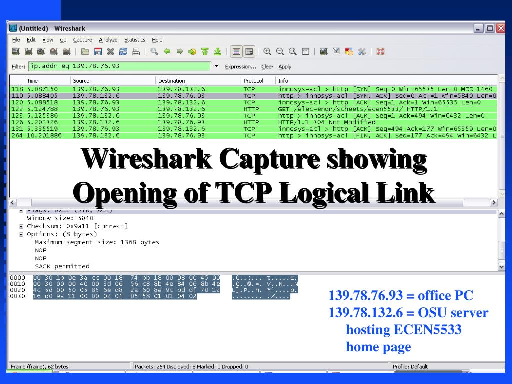 Wireshark Capture showing Opening of TCP Logical Link 139.78.76.93 = office PC 139.78.132.6 = OSU server hosting ECEN5533 home page