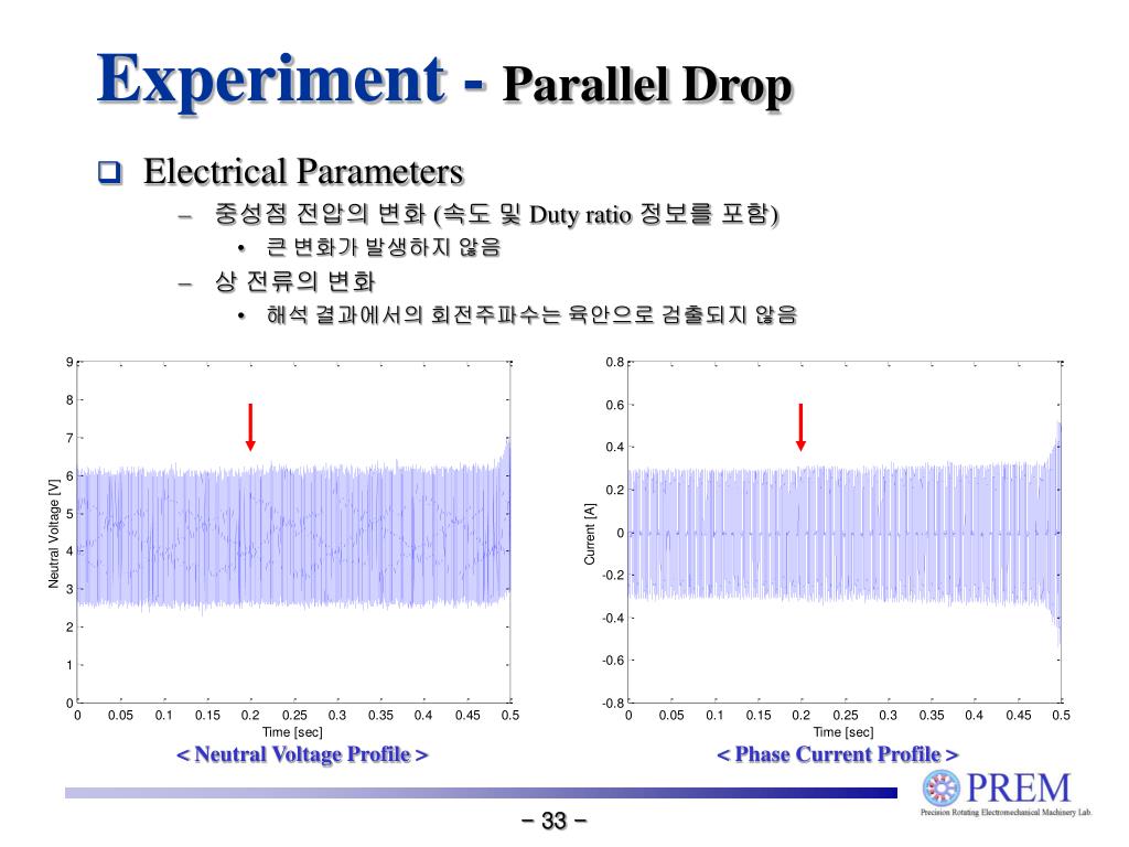 Experiment - Parallel Drop • Electrical Parameters • 중성점 전압의 변화 (속도 및 Duty ratio 정보를 포함) • 큰 변화가 발생하지 않음 • 상 전류의 변화 • 해석 결과에서의 회전주파수는 육안으로 검출되지 않음 < Neutral Voltage Profile > < Phase Current Profile >