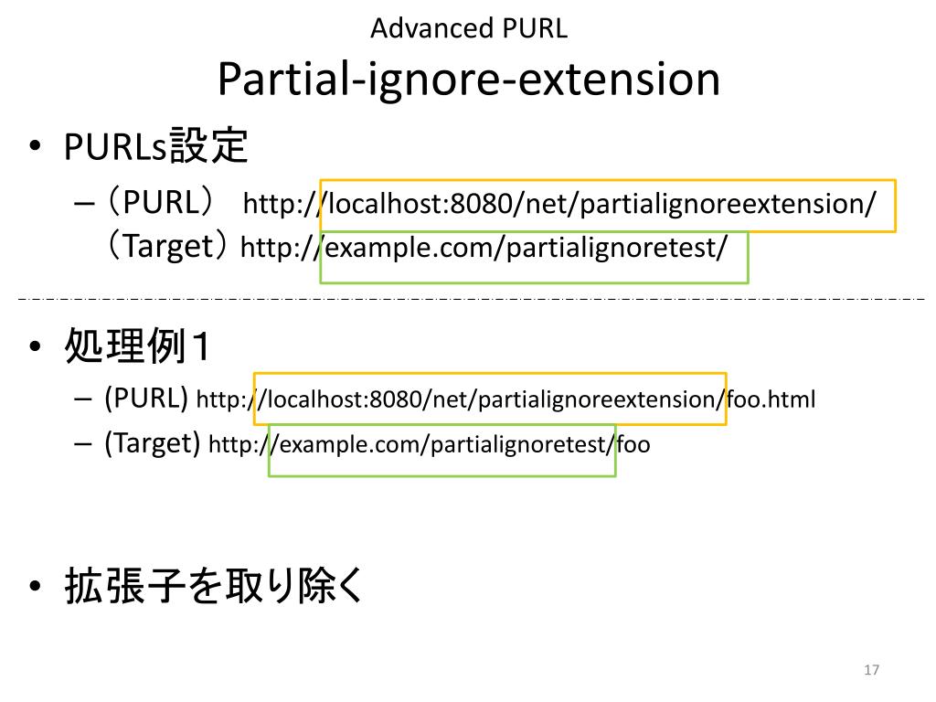 Advanced PURLPartial-ignore-extension • PURLs設定 • (PURL)http://localhost:8080/net/partialignoreextension/(Target) http://example.com/partialignoretest/ • 処理例1 • (PURL) http://localhost:8080/net/partialignoreextension/foo.html • (Target) http://example.com/partialignoretest/foo • 拡張子を取り除く