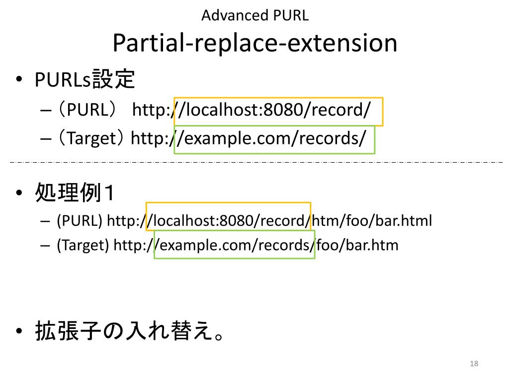 Advanced PURLPartial-append-extension • PURLs設定 • (PURL)http://localhost:8080/net/partialappendextension/(Target) http://example.com/partialappendtest/ • 処理例1 • (PURL) http://localhost:8080/net/partialappendextension/foo/bar/bam?id=fizzle • (Target) http://example.com/partialappendtest/bar/bam.foo?id=fizzle • 拡張子を、クエリーストリングの前に付与する