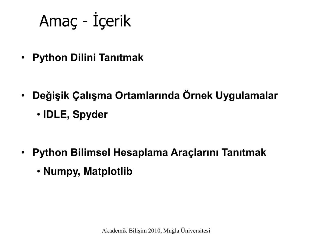Amaç - İçerik • Python Dilini Tanıtmak • Değişik Çalışma Ortamlarında Örnek Uygulamalar • IDLE, Spyder • Python Bilimsel Hesaplama Araçlarını Tanıtmak • Numpy, Matplotlib