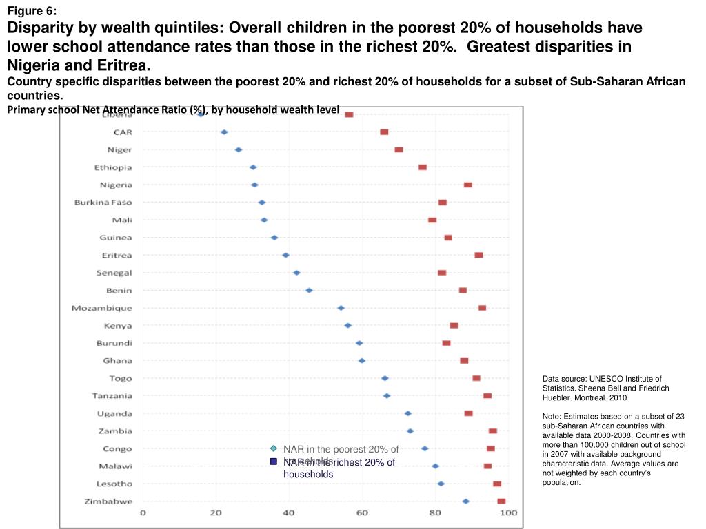 Figure 6: Disparity by wealth quintiles: Overall children in the poorest 20% of households have lower school attendance rates than those in the richest 20%. Greatest disparities in Nigeria and Eritrea. Country specific disparities between the poorest 20% and richest 20% of households for a subset of Sub-Saharan African countries. Primary school Net Attendance Ratio (%), by household wealth level Data source: UNESCO Institute of Statistics. Sheena Bell and Friedrich Huebler. Montreal. 2010 Note: Estimates based on a subset of 23 sub-Saharan African countries with available data 2000-2008. Countries with more than 100,000 children out of school in 2007 with available background characteristic data. Average values are not weighted by each country’s population. NAR in the poorest 20% of households NAR in the richest 20% of households