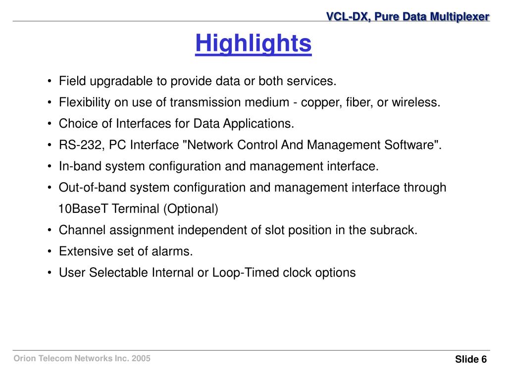 VCL-DX, Pure Data Multiplexer Features • Digital Data services. • Any combination ("mix-n-match") of Digital Data services deployed • from a single VCL-DX "Smart Shelf". • Drop and Insert applications. • Digital Data option may be used for internet access or video conferencing • application. • Wireless applications including interconnecting of Cellular Networks. • Interconnecting VoIP networks. • SCADA applications. • Frame Relay circuit termination. • Powerful Network Management System for monitoring and network control. • Compliance with all relevant ITU-T (CCITT) recommendations. • 3U high, compact construction. Slide 5