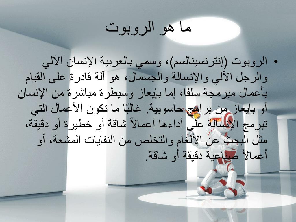 ما هو الروبوت • الروبوت (إنترنسينالسم)، وسمي بالعربية الإنسان الآلي والرجل الآلي والإنسالة والجسمال، هو آلة قادرة على القيام بأعمال مبرمجة سلفا، إما بإيعاز وسيطرة مباشرة من الإنسان أو بإيعاز من برامج حاسوبية. غالبًا ما تكون الأعمال التي تبرمج الإنسالة على أداءها أعمالاً شاقة أو خطيرة أو دقيقة، مثل البحث عن الألغام والتخلص من النفايات المشعة، أو أعمالاً صناعية دقيقة أو شاقة.
