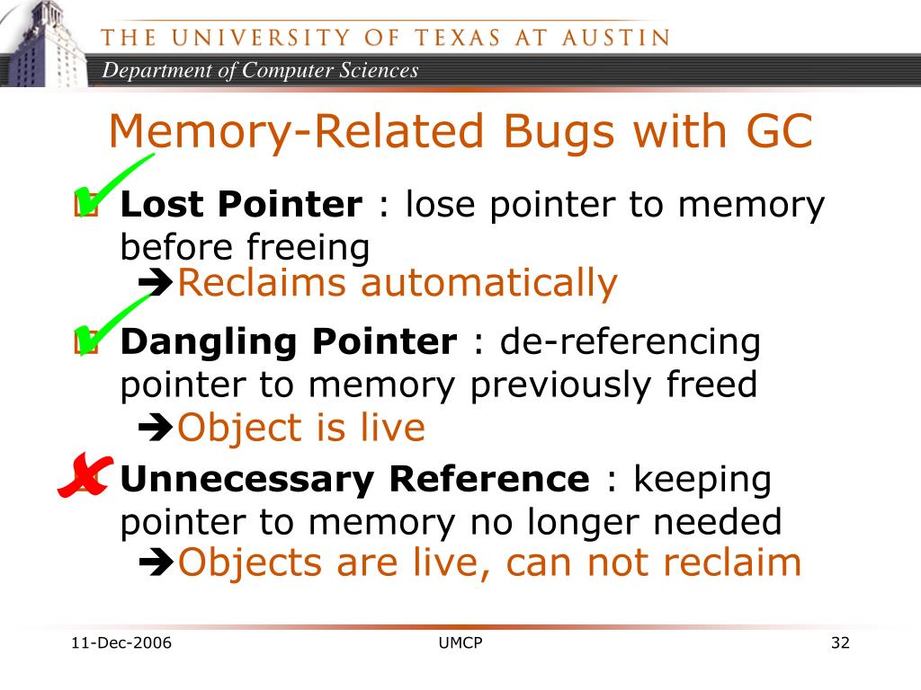 Memory-Related Bugs with GC • Lost Pointer : lose pointer to memory before freeing • Dangling Pointer : de-referencing pointer to memory previously freed • Unnecessary Reference : keeping pointer to memory no longer needed Reclaims automatically Object is live Objects are live, can not reclaim UMCP
