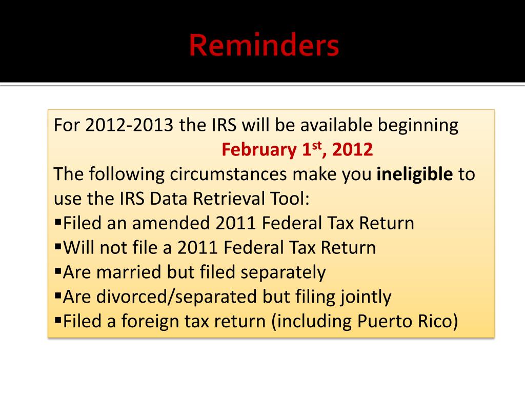 Reminders • For 2012-2013 the IRS will be available beginning • February 1st, 2012 • The following circumstances make you ineligible to use the IRS Data Retrieval Tool: • Filed an amended 2011 Federal Tax Return • Will not file a 2011 Federal Tax Return • Are married but filed separately • Are divorced/separated but filing jointly • Filed a foreign tax return (including Puerto Rico)
