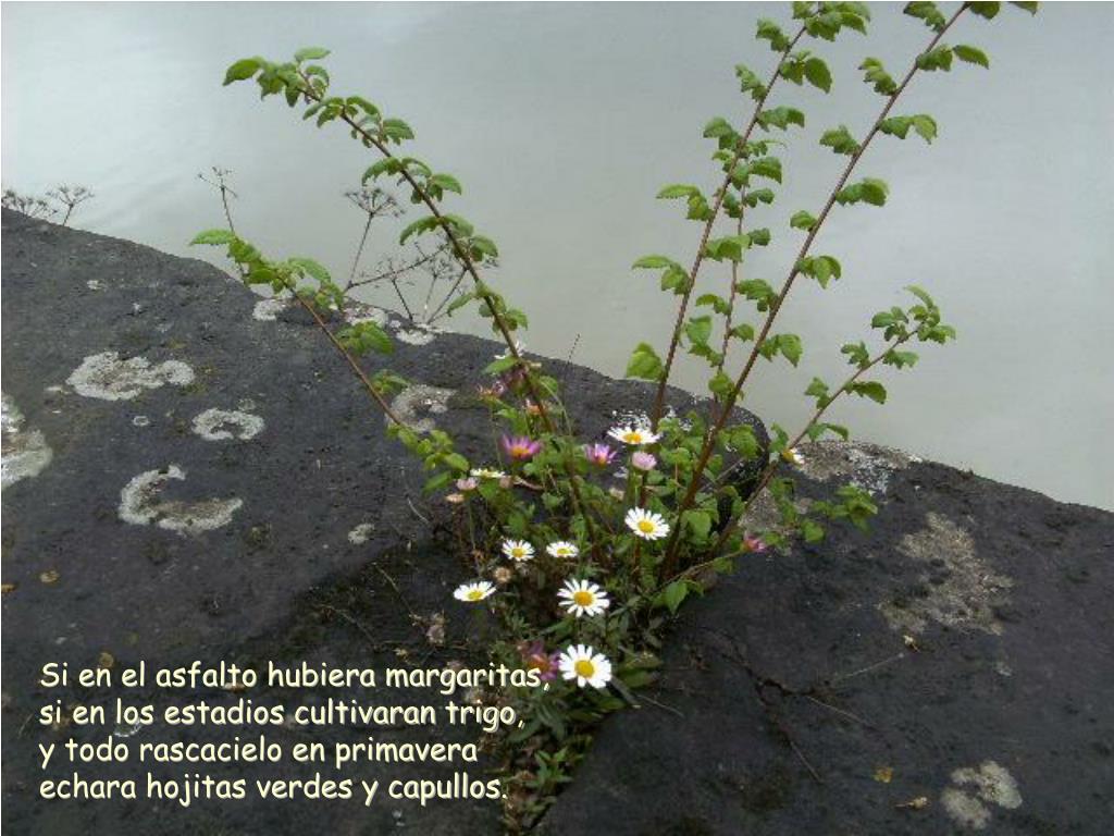 Si en el asfalto hubiera margaritas, si en los estadios cultivaran trigo, y todo rascacielo en primaveraechara hojitas verdes y capullos.
