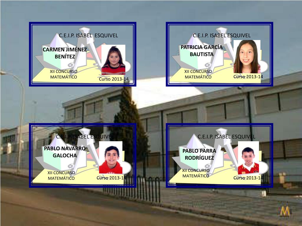 C.E.I.P. ISABEL ESQUIVEL C.E.I.P. ISABEL ESQUIVEL PATRICIA GARCÍA BAUTISTA CARMEN JIMÉNEZ BENÍTEZ XII CONCURSO MATEMÁTICO XII CONCURSO MATEMÁTICO Curso 2013-14 Curso 2013-14 C.E.I.P. ISABEL ESQUIVEL C.E.I.P. ISABEL ESQUIVEL PABLO NAVARRO GALOCHA PABLO PARRA RODRÍGUEZ XII CONCURSO MATEMÁTICO XII CONCURSO MATEMÁTICO Curso 2013-14 Curso 2013-14