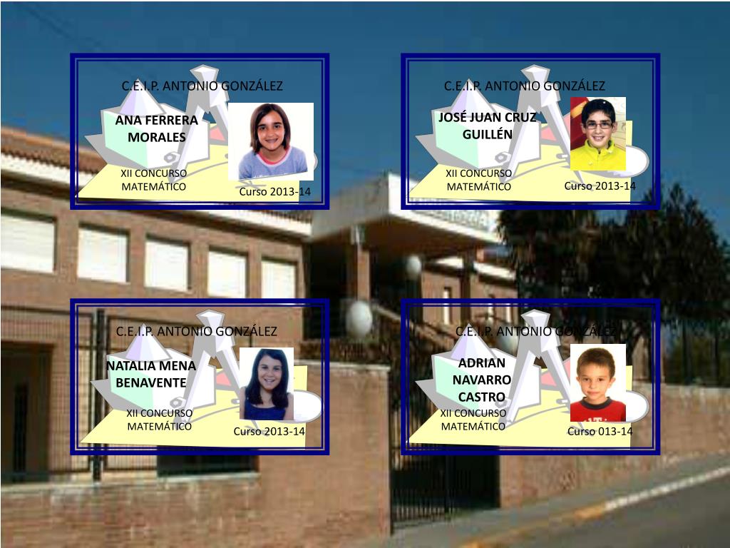 C.E.I.P. ANTONIO GONZÁLEZ C.E.I.P. ANTONIO GONZÁLEZ LUCÍA GARCÍA CARABALLO ANGEL QUIROGA ROMERO XII CONCURSO MATEMÁTICO XII CONCURSO MATEMÁTICO Curso 2013-14 Curso 2013-14 C.E.I.P. ANTONIO GONZÁLEZ C.E.I.P. ANTONIO GONZÁLEZ JESÚS MUÑOZ MENA ÁLVARO MARÍN SÁNCHEZ XII CONCURSO MATEMÁTICO XII CONCURSO MATEMÁTICO Curso 2013-14 Curso 013-14