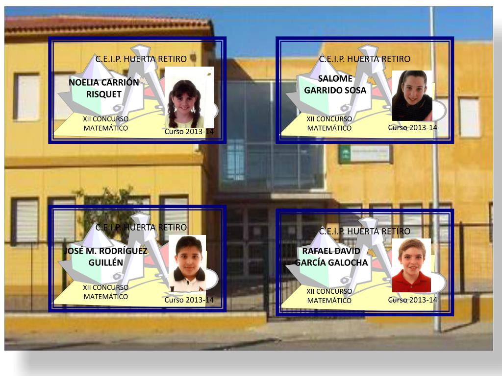 C.E.I.P. HUERTA RETIRO C.E.I.P. HUERTA RETIRO SALOME GARRIDO SOSA NOELIA CARRIÓN RISQUET XII CONCURSO MATEMÁTICO XII CONCURSO MATEMÁTICO Curso 2013-14 Curso 2013-14 C.E.I.P. HUERTA RETIRO C.E.I.P. HUERTA RETIRO JOSÉ M. RODRÍGUEZ GUILLÉN RAFAEL DAVID GARCÍA GALOCHA XII CONCURSO MATEMÁTICO XII CONCURSO MATEMÁTICO Curso 2013-14 Curso 2013-14