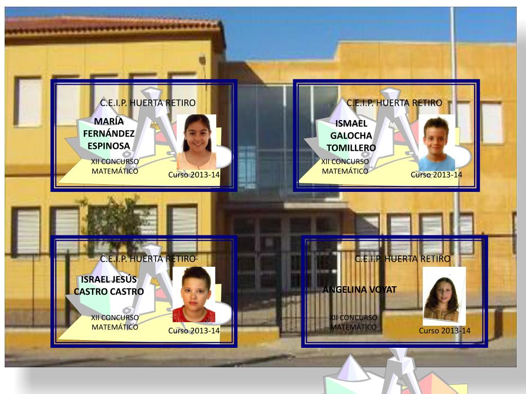 C.E.I.P. HUERTA RETIRO C.E.I.P. HUERTA RETIRO MARÍA FERNÁNDEZ ESPINOSA ISMAEL GALOCHA TOMILLERO XII CONCURSO MATEMÁTICO XII CONCURSO MATEMÁTICO Curso 2013-14 Curso 2013-14 C.E.I.P. HUERTA RETIRO C.E.I.P. HUERTA RETIRO ISRAEL JESÚS CASTRO CASTRO ANGELINA VOYAT XII CONCURSO MATEMÁTICO XII CONCURSO MATEMÁTICO Curso 2013-14 Curso 2013-14