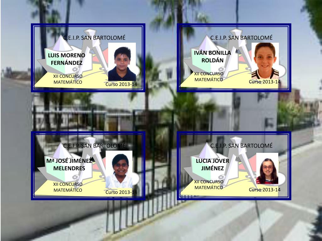 C.E.I.P. SAN BARTOLOMÉ C.E.I.P. SAN BARTOLOMÉ LUIS MORENO FERNÁNDEZ IVÁN BONILLA ROLDÁN XII CONCURSO MATEMÁTICO XII CONCURSO MATEMÁTICO Curso 2013-14 Curso 2013-14 C.E.I.P. SAN BARTOLOMÉ C.E.I.P. SAN BARTOLOMÉ Mª JOSÉ JIMÉNEZ MELENDRES LUCIA JOVER JIMÉNEZ XII CONCURSO MATEMÁTICO XII CONCURSO MATEMÁTICO Curso 2013-14 Curso 2013-14