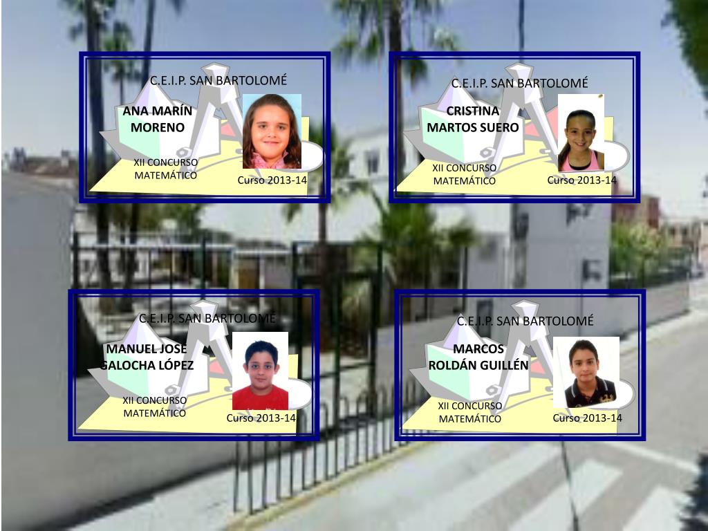 C.E.I.P. SAN BARTOLOMÉ C.E.I.P. SAN BARTOLOMÉ ANA MARÍN MORENO CRISTINA MARTOS SUERO XII CONCURSO MATEMÁTICO XII CONCURSO MATEMÁTICO Curso 2013-14 Curso 2013-14 C.E.I.P. SAN BARTOLOMÉ C.E.I.P. SAN BARTOLOMÉ MANUEL JOSÉ GALOCHA LÓPEZ MARCOS ROLDÁN GUILLÉN XII CONCURSO MATEMÁTICO XII CONCURSO MATEMÁTICO Curso 2013-14 Curso 2013-14