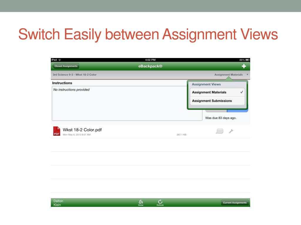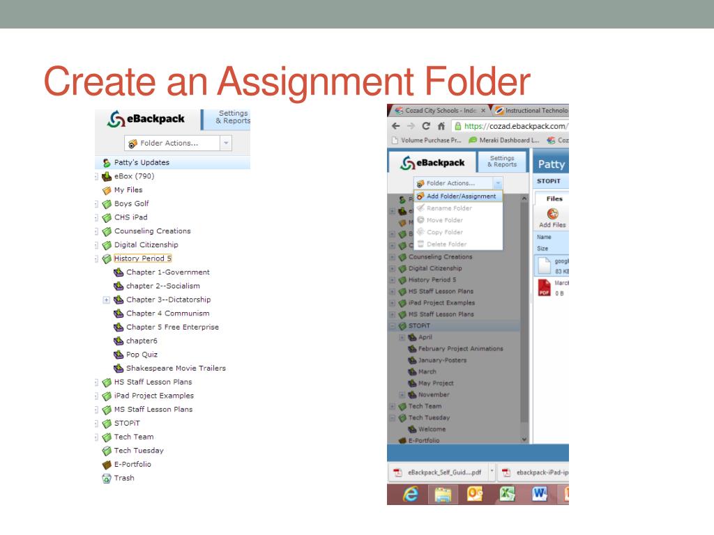 eBackpack for Teachers • Safely store files online • Workflow made easier for iPads • Files available anywhere • Create a paperless classroom