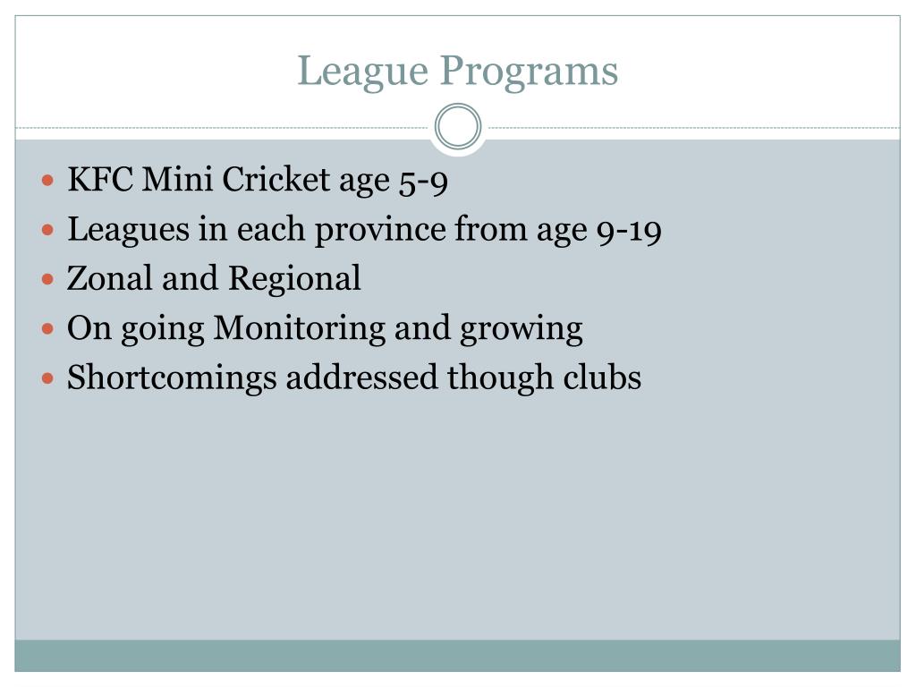 League Programs KFC Mini Cricket age 5-9 Leagues in each province from age 9-19 Zonal and Regional On going Monitoring and growing Shortcomings addressed though clubs