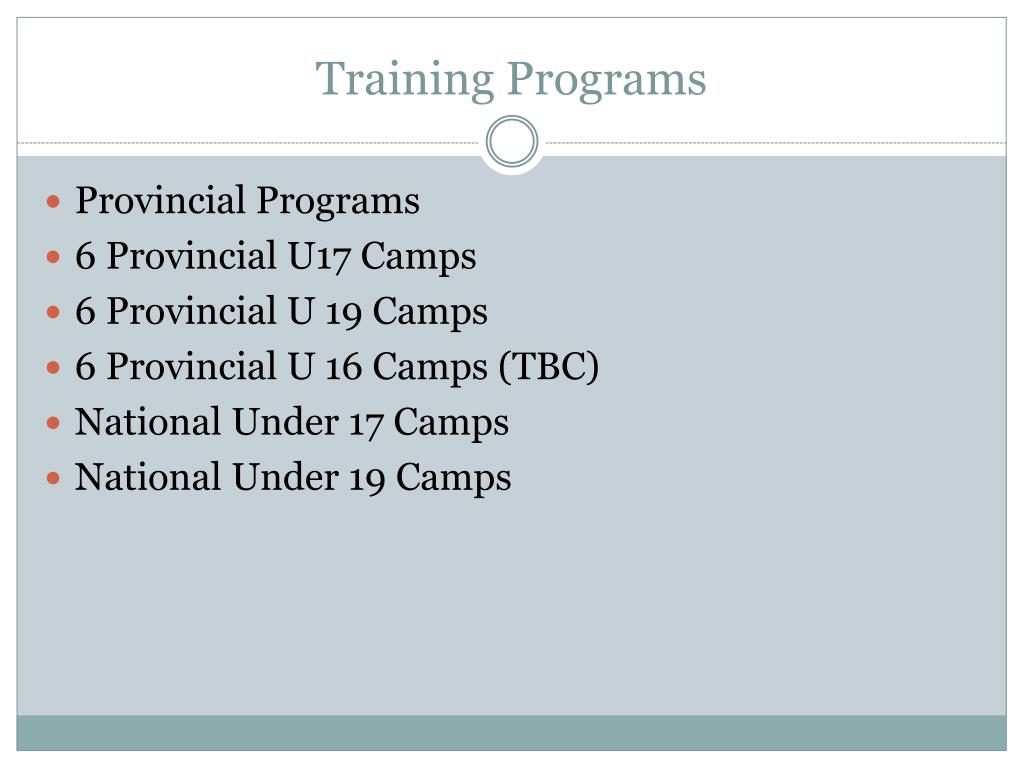 Training Programs Provincial Programs 6 Provincial U17 Camps 6 Provincial U 19 Camps 6 Provincial U 16 Camps (TBC) National Under 17 Camps National Under 19 Camps