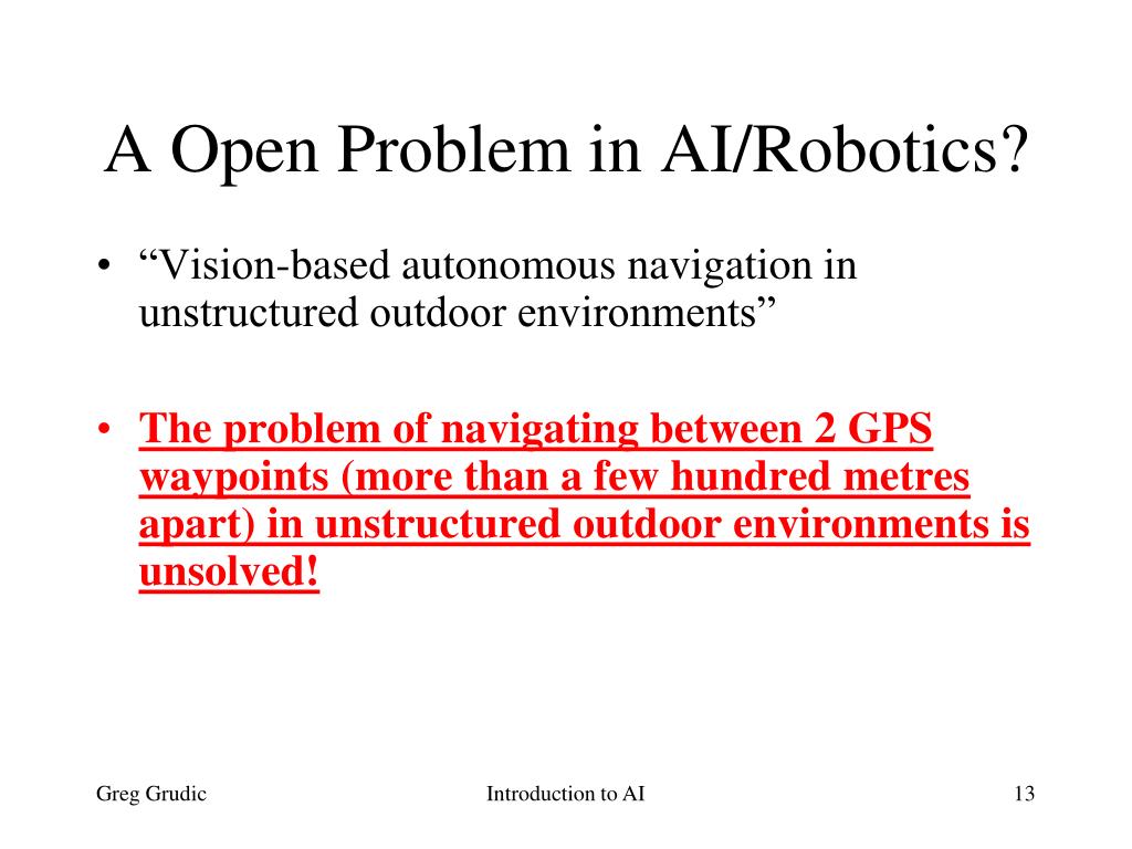 A Open Problem in AI/Robotics? • “Vision-based autonomous navigation in unstructured outdoor environments” • The problem of navigating between 2 GPS waypoints (more than a few hundred metres apart) in unstructured outdoor environments is unsolved! Introduction to AI