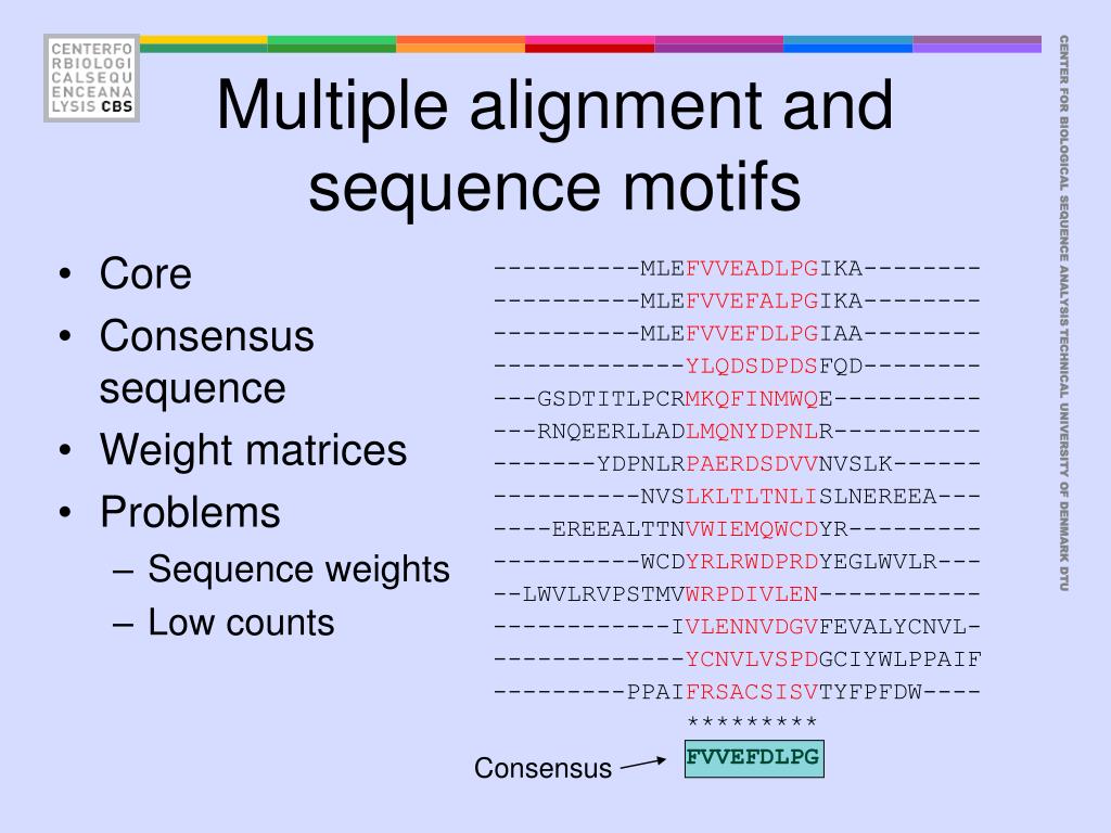 Outline • Multiple alignments and sequence motifs • Weight matrices and consensus sequence • Sequence weighting • Low (pseudo) counts • Information content • Sequence logos • Mutual information • Example from the real world • HMM’s and profile HMM’s • TMHMM (trans-membrane protein) • Gene finding • Links to HMM packages