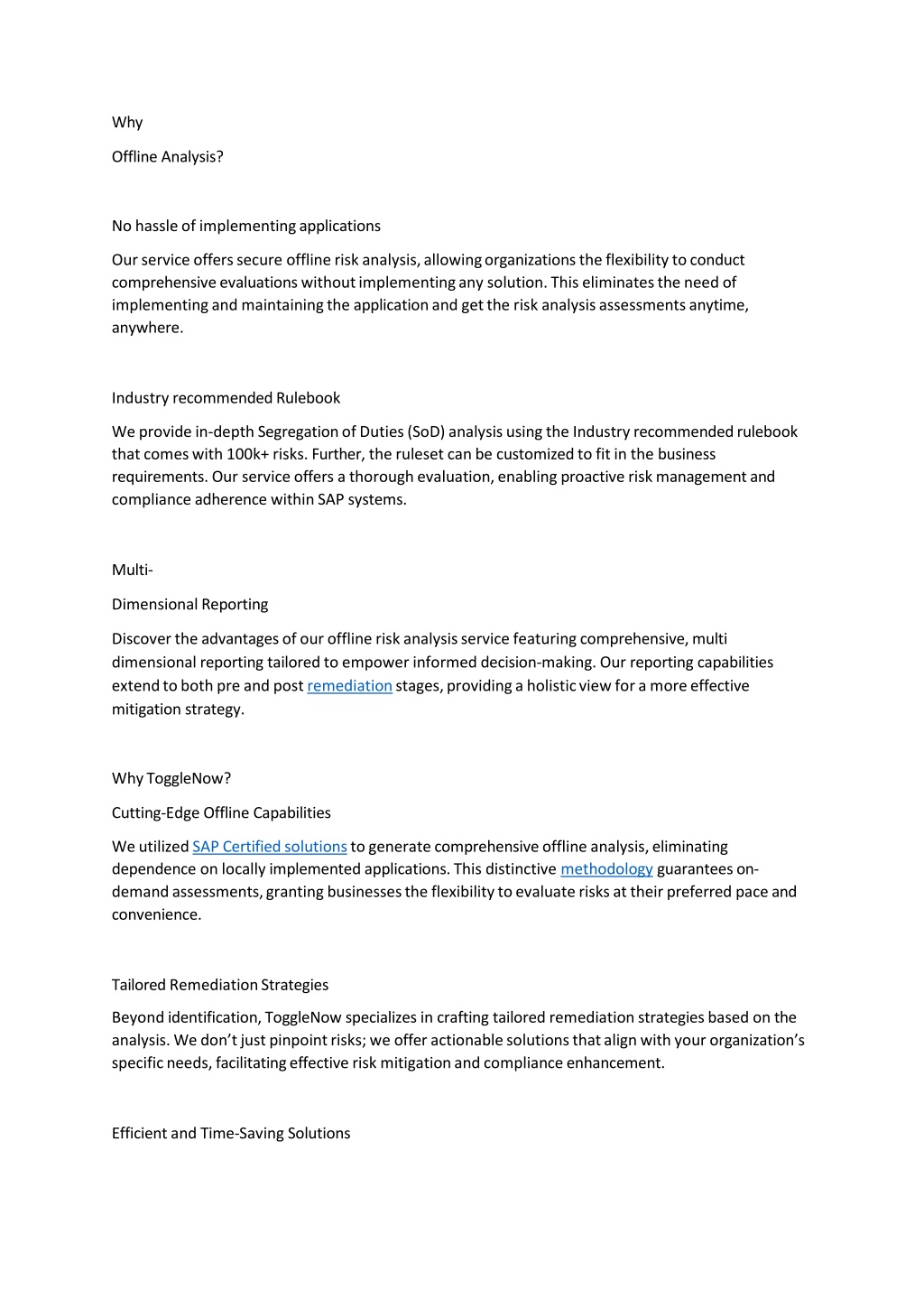 Why Offline Analysis? Nohassleofimplementingapplications Ourserviceofferssecure offlineriskanalysis,allowingorganizationstheflexibilitytoconduct comprehensiveevaluationswithoutimplementinganysolution.Thiseliminatestheneedof implementingandmaintainingtheapplicationandgettheriskanalysisassessmentsanytime, anywhere. Industry recommendedRulebook Weprovidein-depthSegregationofDuties(SoD)analysisusingtheIndustryrecommendedrulebook thatcomeswith100k+risks. Further,therulesetcanbe customizedtofitinthebusiness requirements. Ourservice offers athoroughevaluation,enablingproactive riskmanagement and complianceadherence withinSAPsystems. Multi- DimensionalReporting Discovertheadvantagesofourofflineriskanalysisservicefeaturingcomprehensive,multi dimensionalreportingtailored toempowerinformeddecision-making.Ourreportingcapabilities extendtobothpreandpostremediationstages,providingaholisticviewforamoreeffective mitigationstrategy. WhyToggleNow? Cutting-EdgeOfflineCapabilities WeutilizedSAPCertifiedsolutionstogeneratecomprehensiveofflineanalysis,eliminating dependence onlocally implementedapplications.This distinctivemethodologyguaranteeson- demandassessments,grantingbusinessestheflexibilitytoevaluaterisksattheirpreferredpaceand convenience. TailoredRemediationStrategies Beyond identification,ToggleNowspecializesin craftingtailored remediationstrategiesbasedonthe analysis.Wedon’tjustpinpointrisks;weofferactionablesolutionsthatalignwithyourorganization’s specificneeds,facilitatingeffectiveriskmitigationandcomplianceenhancement. Efficientand Time-SavingSolutions