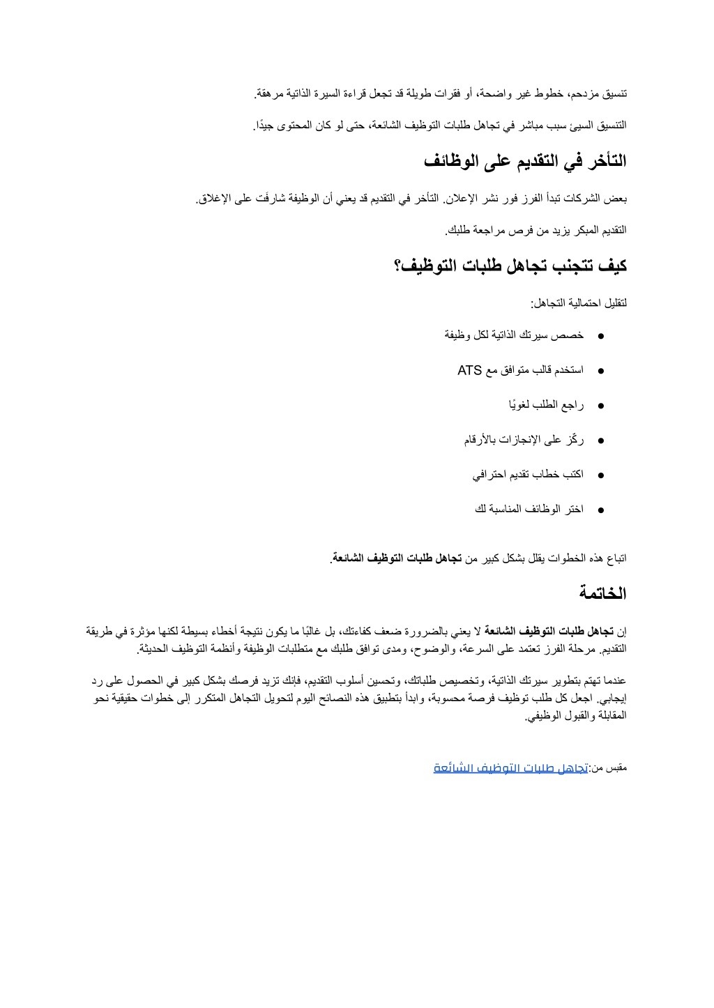 ،ﺔﺣﺿاو وأ تارﻘﻓ ﺔﻠﯾوط دﻗ لﻌﺟﺗ ةءارﻗ ةرﯾﺳﻟا ﺔﯾﺗاذﻟا .ﺔﻘھرﻣ رﯾﻏ طوطﺧ ،مﺣدزﻣ قﯾﺳﻧﺗ ،ﺔﻌﺋﺎﺷﻟا ﻰﺗﺣ وﻟ نﺎﻛ ىوﺗﺣﻣﻟا .اًدﯾﺟ فﯾظوﺗﻟا تﺎﺑﻠط لھﺎﺟﺗ رﺷﺎﺑﻣ ﻲﻓ بﺑﺳ ﺊﯾﺳﻟا قﯾﺳﻧﺗﻟا فﺋﺎظوﻟا ﻰﻠﻋ مﯾدﻘﺗﻟا رﺧﺄﺗﻟا ﻲﻓ تﺎﻛرﺷﻟا أدﺑﺗ زرﻔﻟا روﻓ رﺷﻧ .نﻼﻋﻹا رﺧﺄﺗﻟا ﻲﻓ مﯾدﻘﺗﻟا دﻗ ﻲﻧﻌﯾ نأ ﺔﻔﯾظوﻟا تَﻓرﺎﺷ ﻰﻠﻋ .قﻼﻏﻹا ضﻌﺑ .كﺑﻠط ﺔﻌﺟارﻣ صرﻓ نﻣ دﯾزﯾ رﻛﺑﻣﻟا مﯾدﻘﺗﻟا ؟فﯾظوﺗﻟا تﺎﺑﻠط لھﺎﺟﺗ بﻧﺟﺗﺗ فﯾﻛ :لھﺎﺟﺗﻟا ﺔﯾﻟﺎﻣﺗﺣا لﯾﻠﻘﺗﻟ ﺔﻔﯾظو لﻛﻟ ﺔﯾﺗاذﻟا كﺗرﯾﺳ صﺻﺧ ● ATS قﻓاوﺗﻣ ﻊﻣ بﻟﺎﻗ مدﺧﺗﺳا ● ﺎًﯾوﻐﻟ بﻠطﻟا ﻊﺟار ● مﺎﻗرﻷﺎﺑ تازﺎﺟﻧﻹا ﻰﻠﻋ زّﻛر ● ﻲﻓارﺗﺣا مﯾدﻘﺗ بﺎطﺧ بﺗﻛا ● ﺔﺑﺳﺎﻧﻣﻟا كﻟ فﺋﺎظوﻟا رﺗﺧا ● تاوطﺧﻟا لﻠﻘﯾ لﻛﺷﺑ رﯾﺑﻛ نﻣ لھﺎﺟﺗ تﺎﺑﻠط فﯾظوﺗﻟا ﺔﻌﺋﺎﺷﻟا . هذھ عﺎﺑﺗا ﺔﻣﺗﺎﺧﻟا ،كﺗءﺎﻔﻛ لﺑ ﺎًﺑﻟﺎﻏ ﺎﻣ نوﻛﯾ ﺔﺟﯾﺗﻧ ءﺎطﺧأ ﺔطﯾﺳﺑ ﺎﮭﻧﻛﻟ ةرﺛؤﻣ ﻲﻓ ﺔﻘﯾرط تﺎﺑﻠط ﺔﻠﺣرﻣ زرﻔﻟا دﻣﺗﻌﺗ ﻰﻠﻋ ،ﺔﻋرﺳﻟا ،حوﺿوﻟاو ىدﻣو قﻓاوﺗ كﺑﻠط ﻊﻣ تﺎﺑﻠطﺗﻣ ﺔﻔﯾظوﻟا ﺔﻣظﻧأو فﯾظوﺗﻟا .ﺔﺛﯾدﺣﻟا فﻌﺿ ةرورﺿﻟﺎﺑ ﻲﻧﻌﯾ ﻻ ﺔﻌﺋﺎﺷﻟا فﯾظوﺗﻟا لھﺎﺟﺗ نإ .مﯾدﻘﺗﻟا لوﺻﺣﻟا ﻰﻠﻋ در مﺗﮭﺗ لﻌﺟا لﻛ بﻠط فﯾظوﺗ ﺔﺻرﻓ ،ﺔﺑوﺳﺣﻣ أدﺑاو قﯾﺑطﺗﺑ هذھ ﺢﺋﺎﺻﻧﻟا موﯾﻟا لﯾوﺣﺗﻟ لھﺎﺟﺗﻟا ررﻛﺗﻣﻟا ﻰﻟإ تاوطﺧ ﺔﯾﻘﯾﻘﺣ وﺣﻧ ﻲﻓ رﯾﺑﻛ لﻛﺷﺑ كﺻرﻓ دﯾزﺗ كﻧﺈﻓ ،مﯾدﻘﺗﻟا بوﻠﺳأ نﯾﺳﺣﺗو ،كﺗﺎﺑﻠط صﯾﺻﺧﺗو ،ﺔﯾﺗاذﻟا كﺗرﯾﺳ رﯾوطﺗﺑ ﺎﻣدﻧﻋ .ﻲﺑﺎﺟﯾإ ﺔﻠﺑﺎﻘﻣﻟا .ﻲﻔﯾظوﻟا لوﺑﻘﻟاو ﺔﻌﺋﺎﺸﻟا ﻒﻴﻇﻮﺘﻟا تﺎﺒﻠﻃ ﻞﻫﺎﺠﺗ :نﻣ سﺑﻘﻣ