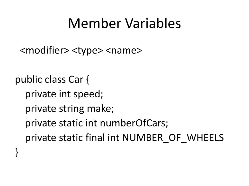 Member Variables <modifier> <type> <name> public class Car { private int speed; private string make; private static intnumberOfCars; private static final int NUMBER_OF_WHEELS }