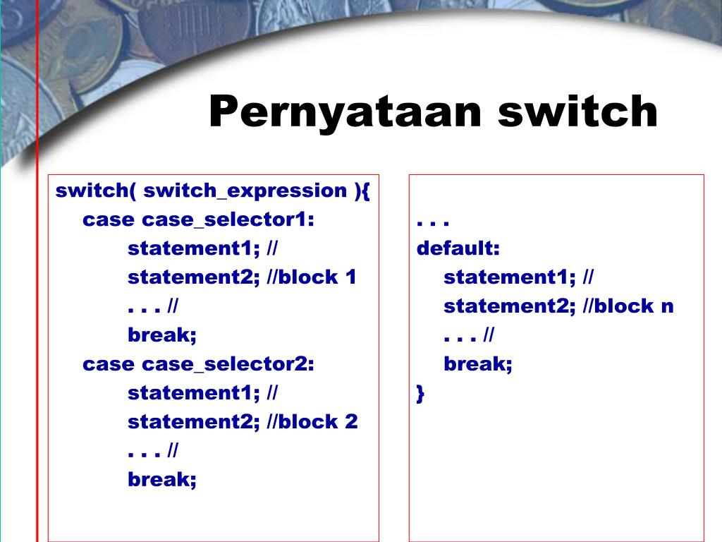 Pernyataan switch switch( switch_expression ){ case case_selector1: statement1; // statement2; //block 1 . . . // break; case case_selector2: statement1; // statement2; //block 2 . . . // break; . . . default: statement1; // statement2; //block n . . . // break; }