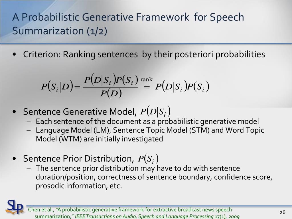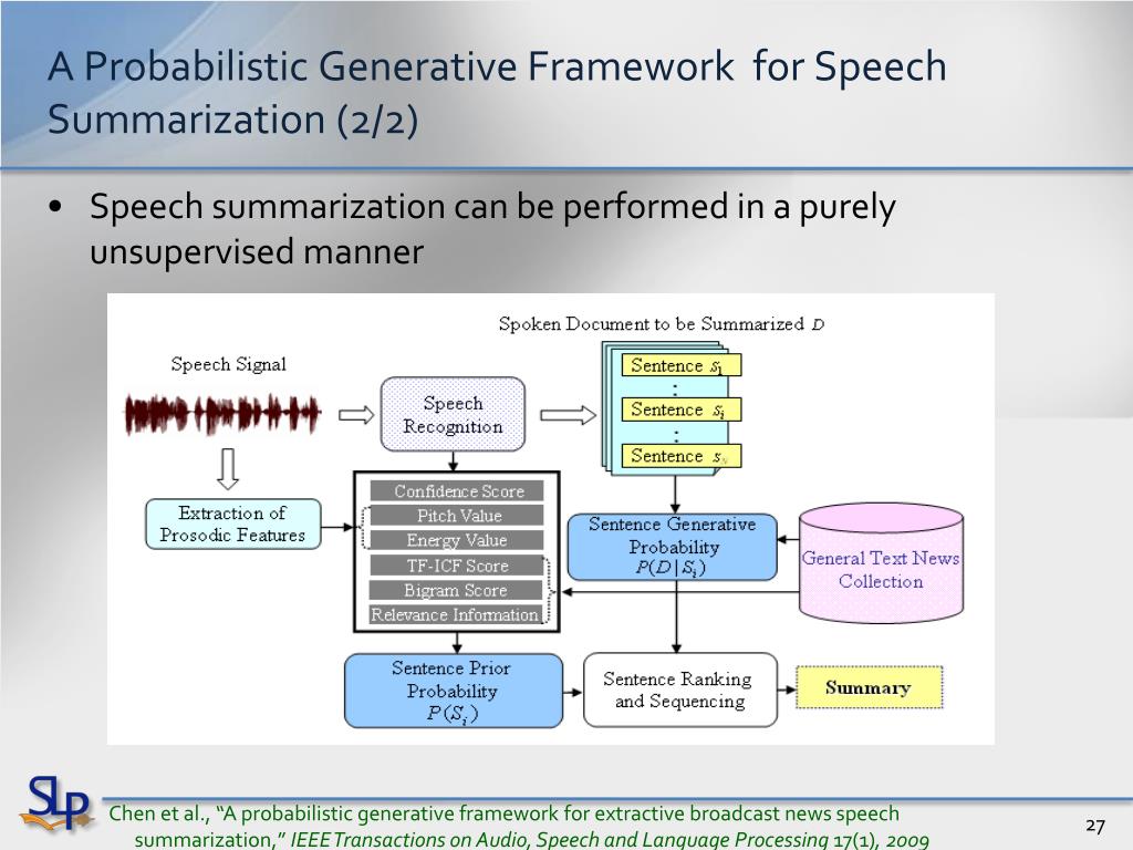 A Probabilistic Generative Framework for Speech Summarization (1/2) • Criterion: Ranking sentences by their posteriori probabilities • Sentence Generative Model, • Each sentence of the document as a probabilistic generative model • Language Model (LM), Sentence Topic Model (STM) and Word Topic Model (WTM) are initially investigated • Sentence Prior Distribution, • The sentence prior distribution may have to do with sentence duration/position, correctness of sentence boundary, confidence score, prosodic information, etc. Chen et al., “A probabilistic generative framework for extractive broadcast news speech summarization,” IEEE Transactions on Audio, Speech and Language Processing 17(1), 2009