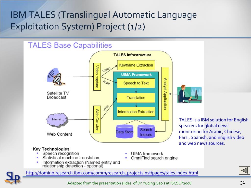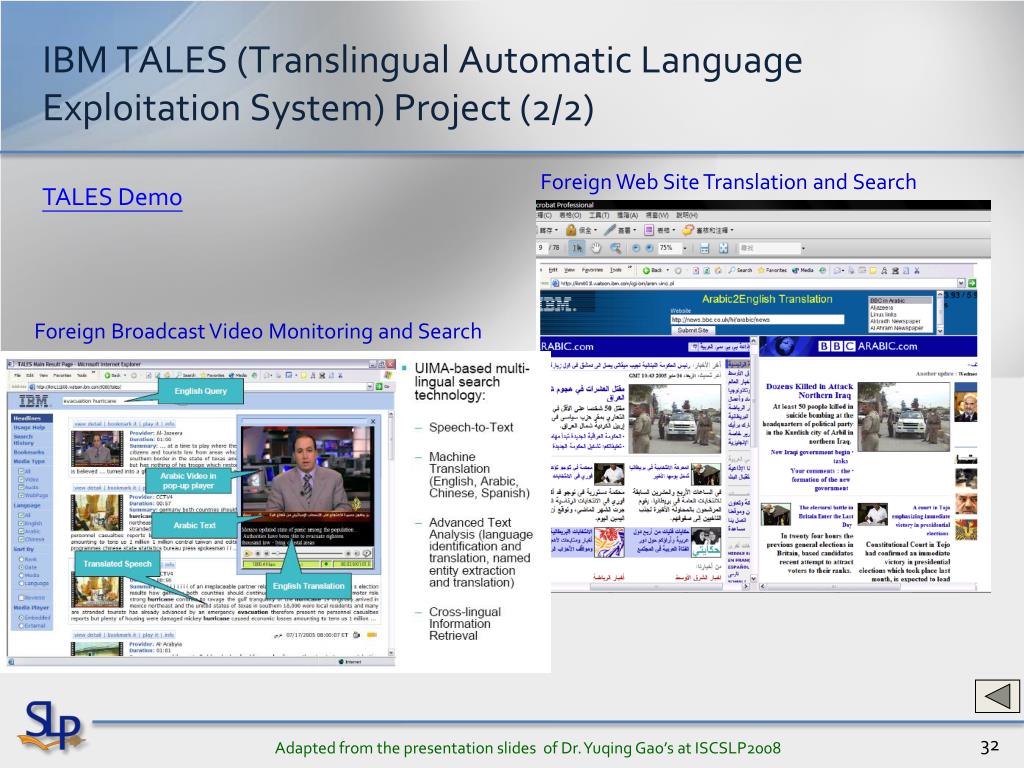 IBM TALES (Translingual Automatic Language Exploitation System)Project (1/2) TALES is a IBM solution for English speakers for global news monitoring for Arabic, Chinese, Farsi, Spanish, and English video and web news sources. http://domino.research.ibm.com/comm/research_projects.nsf/pages/tales.index.html • Adapted from the presentation slides of Dr. YuqingGao’s at ISCSLP2008