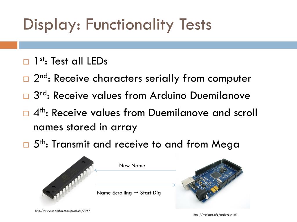 Display: Functionality Tests • 1st: Test all LEDs • 2nd: Receive characters serially from computer • 3rd: Receive values from Arduino Duemilanove • 4th: Receive values from Duemilanove and scroll names stored in array • 5th: Transmit and receive to and from Mega New Name Name Scrolling Start Dig http://www.sparkfun.com/products/7957 http://rhinoart.info/archives/101