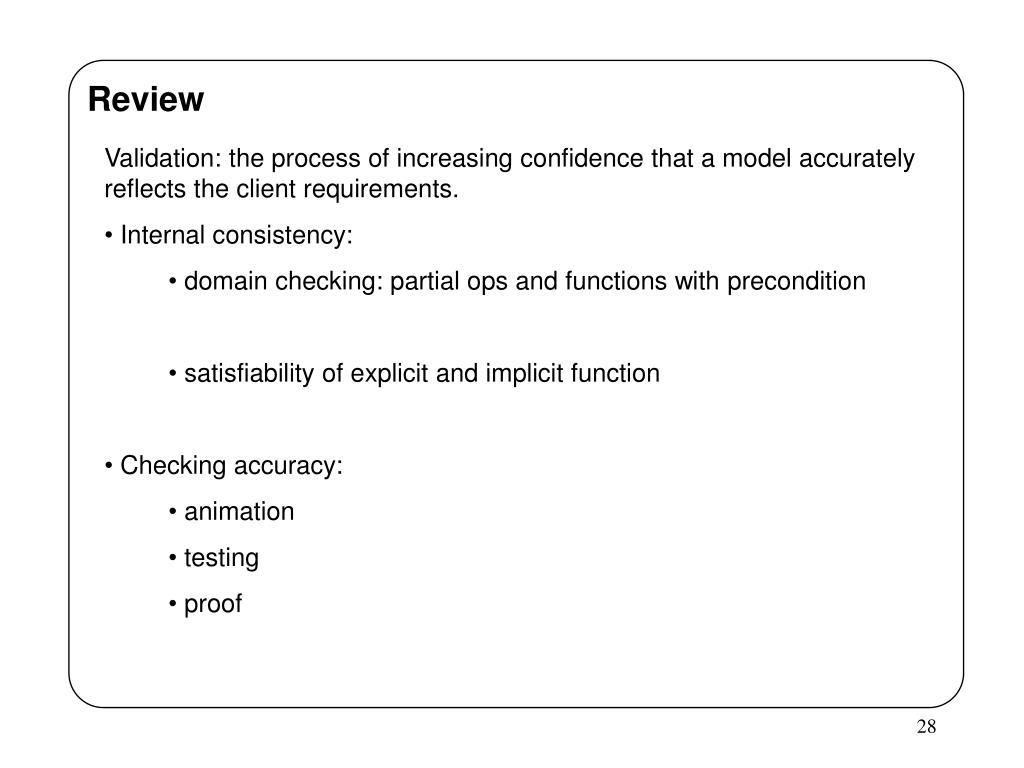 Review • Validation: the process of increasing confidence that a model accurately reflects the client requirements. • Internal consistency: • domain checking: partial ops and functions with precondition • satisfiability of explicit and implicit function • Checking accuracy: • animation • testing • proof