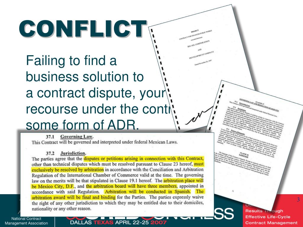 CONFLICT Failing to find a business solution to a contract dispute, your recourse under the contract is some form of ADR.