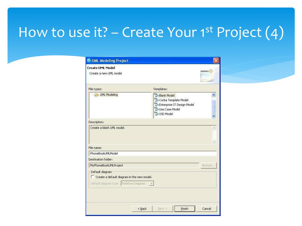 How to use it? – Create Your 1st Project (1) Follow: File> New> Project> Others Select UML Project, then click Next Key in MyPhoneBookUMLProject as project name Select Blank model Key in Phone Book UML Model as UML model’s file name, remember to cancel create a default diagram in the new model. Then, click Finish. Step by step screen shots follows: