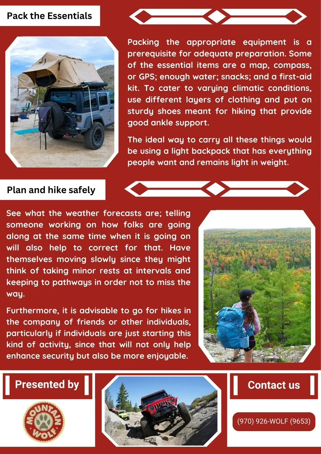 Pack the Essentials Packing the appropriate equipment is a prerequisite for adequate preparation. Some of the essential items are a map, compass, or GPS; enough water; snacks; and a first-aid kit. To cater to varying climatic conditions, use different layers of clothing and put on sturdy shoes meant for hiking that provide good ankle support. The ideal way to carry all these things would be using a light backpack that has everything people want and remains light in weight. Plan and hike safely See what the weather forecasts are; telling someone working on how folks are going along at the same time when it is going on will also help to correct for that. Have themselves moving slowly since they might think of taking minor rests at intervals and keeping to pathways in order not to miss the way. Furthermore, it is advisable to go for hikes in the company of friends or other individuals, particularly if individuals are just starting this kind of activity, since that will not only help enhance security but also be more enjoyable. Presented by Contact us (970) 926-WOLF (9653)